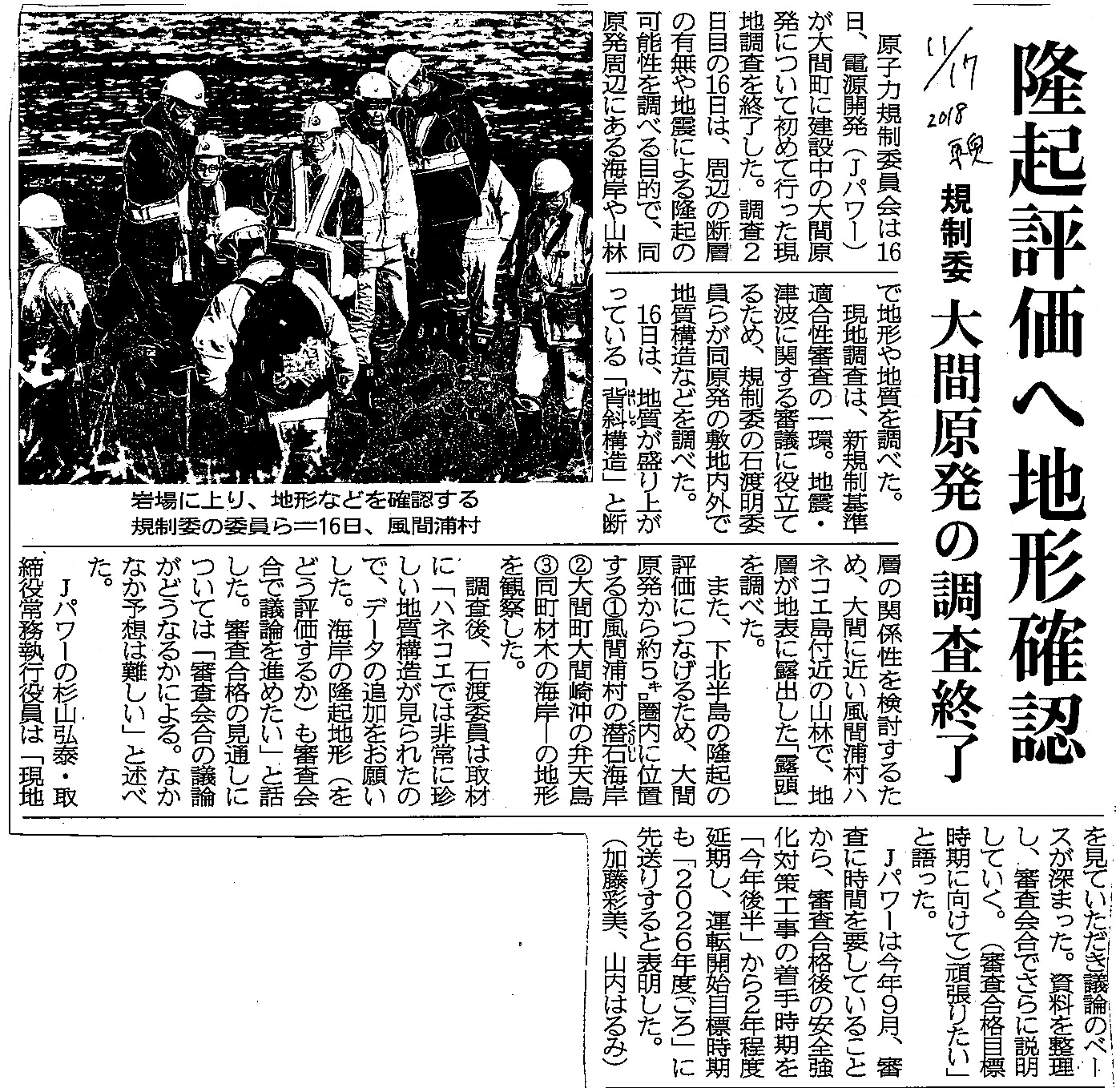 | [2018_11_17_01]隆起評価へ地形確認 規制委 大間原発の調査終了(東奥日報2018年11月17日) |