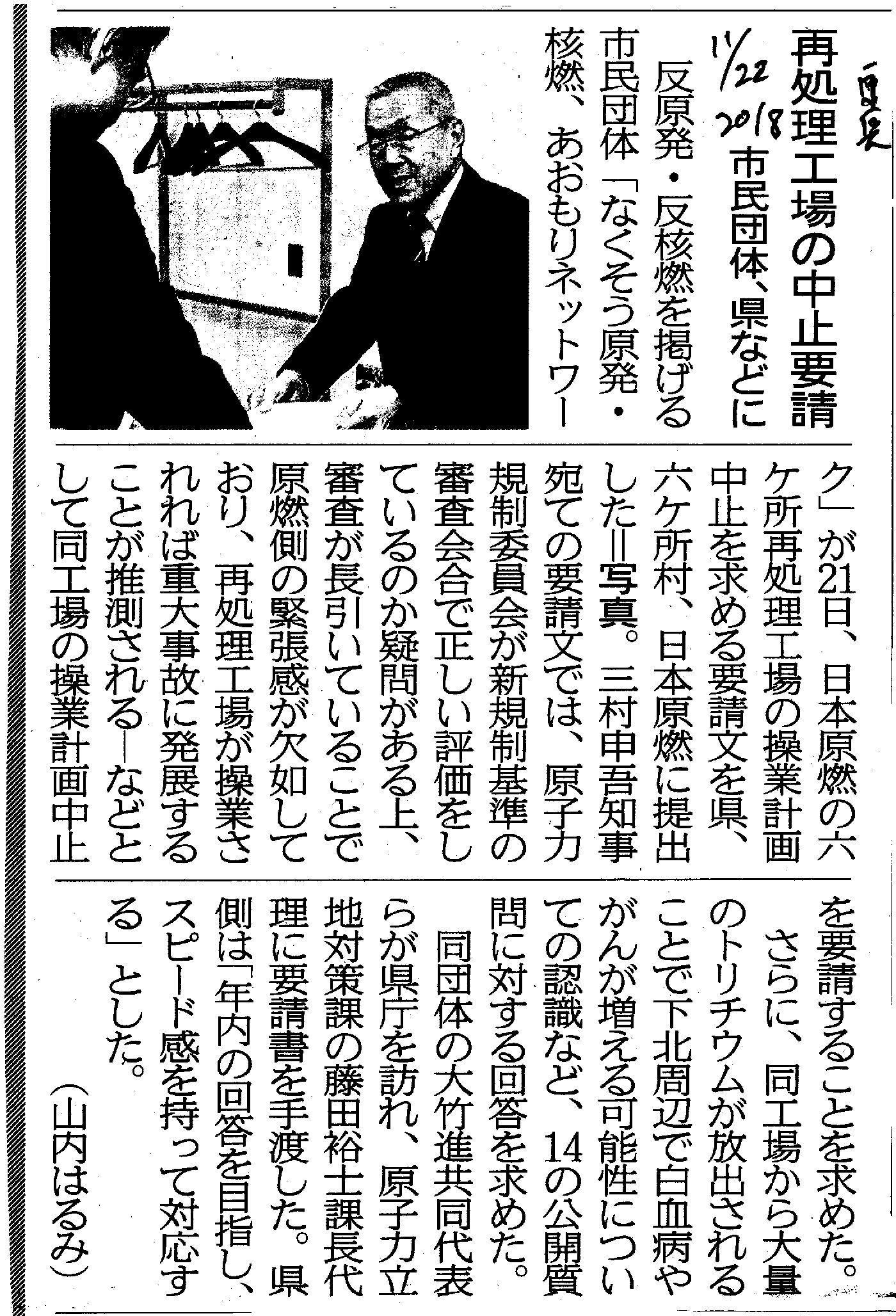 | [2018_11_22_02]再処理工場の中止要請 市民団体、県などに(東奥日報2018年11月22日) |
