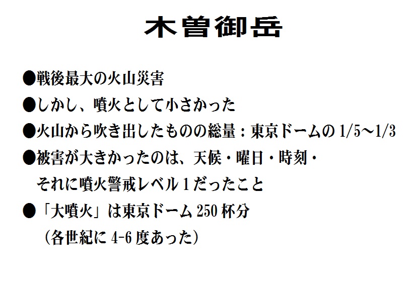 【島村】火山学者として言いたいことは、木曽御岳の噴火は戦後最大といっても、噴火としては小さいものだったということです。噴火の量というのは、実は対数目盛に表すのですが、とても小さいものからとても大きいものまであります。具体的にいうと、火山から吹き出したものは、火山灰であったり、火砕流だったり、溶岩だったり等々ありますが、、それらの総量を測る。東京ドームではかると、1/5〜1/3だった。噴火としてはそんなに大きいものではありません。被害が大きかった理由は、週末の土曜日だった、天気が非常に良かった、昼頃で、皆さんが山頂付近で弁当を広げていたころだった。そういった意味で、山頂付近に人が集まっているときに噴火が始まって、たくさんの人が犠牲になった。西日本にある3000m級の山だが、山の近くまで、道があり、たくさんの人が集まっていたのが不幸でした。ところが、1/5〜1/3とそんなに大きな量ではなかった。実は「大噴火」というのがありまして、それは東京ドーム250杯分、木曽御岳の噴火と二桁以上、大きいものです。
