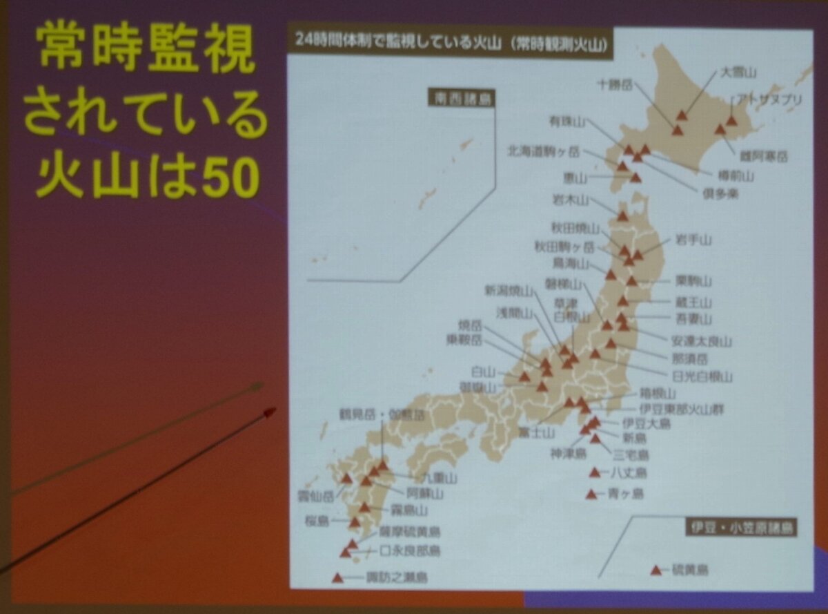 【島村】気象庁は特に危ない火山を常時監視しています。常時監視は、東京気象台、仙台管区気象台、札幌管区気象台等のデータを集めて、そこで、担当者がいます。常時監視している火山は50あります。110から50を選んだ。ただ選んだ基準というのは非常にあいまいです。特に御岳山は、ずっと死火山で噴火しないものと思われていたのに、噴火してしまった。それから慌てて、常時監視にしたわけです。