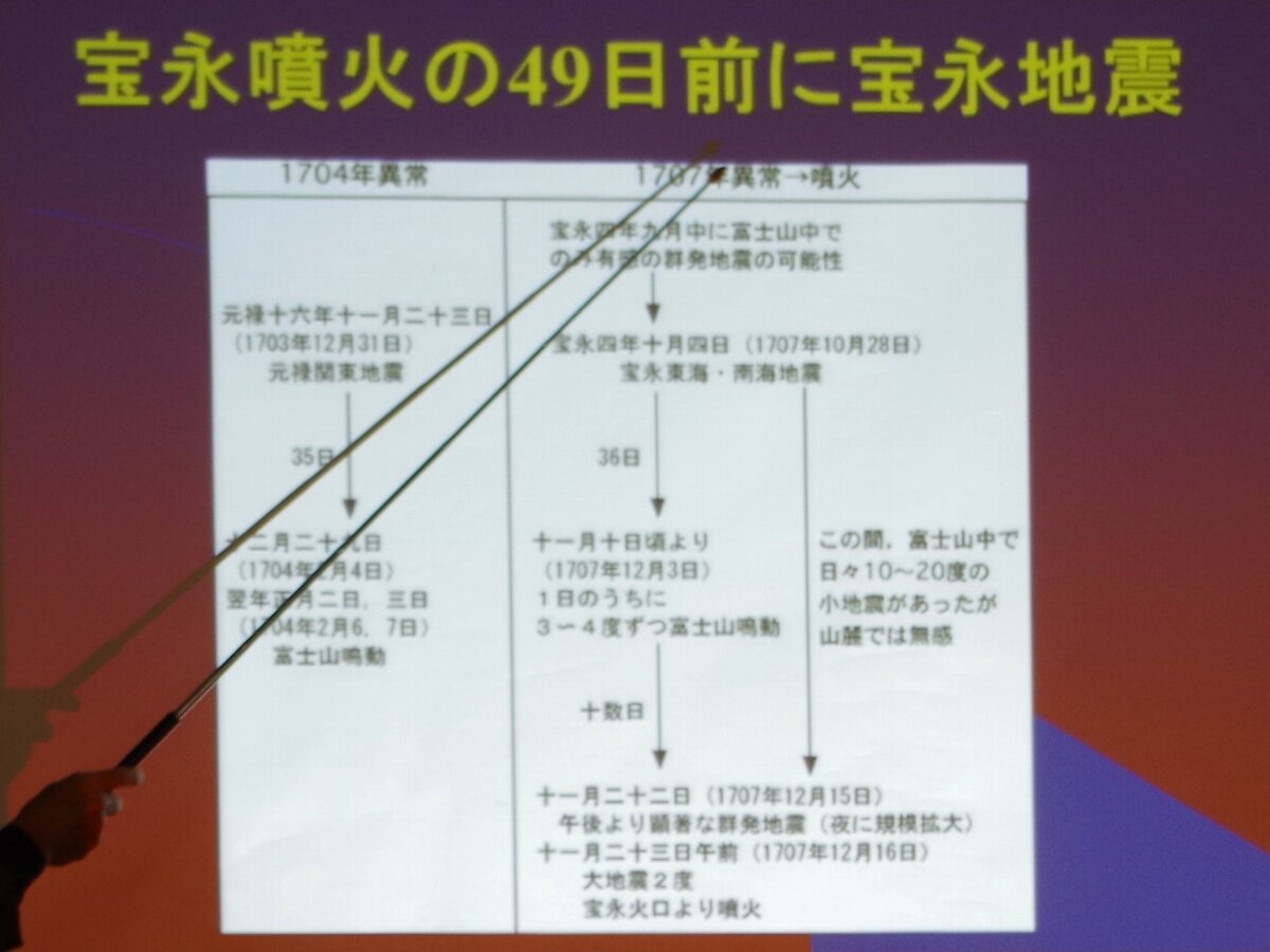 【補足】 ・「富士山噴火 過去の前兆や大地震との連動についての基礎知識」(小山真人氏)の「2.大地震は富士山の噴火を誘発させるか」の中に「富士山の1704年異常と1707年噴火の事件推移のまとめ」という図がある。 ・当講演レジュメの相当ヶ所を以下に抜粋する。 「「地震が誘発した」有名な噴火がある。1707 年の宝永地震の 49 日後に富士山が大噴火した宝永噴火だ。この噴火は富士山の三大噴火のひとつになった大きな噴火だった。関東地方にも多量の火山灰を降らせた。この火山灰は、噴火後わずか 2 時間で江戸に達した。富士山から新宿まで 100km しか離れていないことを忘れてはいけない。 三大噴火のあとの二つは平安時代に発生した「延暦の大噴火」と「貞観の大噴火」である。そのほか、平安時代 400 年間に、富士山は 10 回も噴火している。平安時代のはじめの 300 年の間に 10回(一説によれば 12回)も噴火したのである。 宝永噴火以来、富士山が 300 年間も噴火しない状態が続いているのは異例である。また、世界的に見ても、長い間噴火しなくて、次に噴火したときには大きな噴火になる例が多い。 いま恐れられている「南海トラフ地震」は宝永地震が再来するような大きな規模ではないかと言われている。フィリピン海プレートが年々動いているので、地震エネルギーも年々蓄積している。じつはひとつ先代の地震、東南海地震(1944 年)と南海地震(1946 年)は歴代の先祖と比べても小さめだった。つまり、残っている地震エネルギーが次回に加算される可能性がある。 もしこの地震が起きれば、以前と同じように火山の噴火を誘発する可能性がある。ちなみに、南海トラフ地震の先祖のひとつである慶長地震(1605 年)のすぐあとには八丈島の火山が噴火した。」 |
