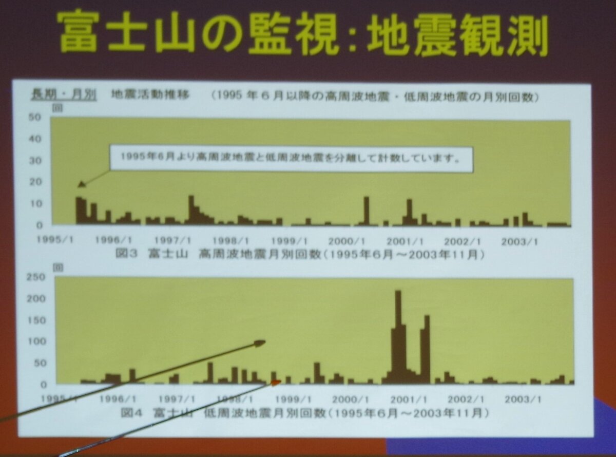 このスライドの上下のヒストグラムは何かというと、上は高周波地震(※)、?の地震で、1995年1月から2003年1月ぐらいにかけてのものです。下半分は何かというと、富士山の下にしかない、非常に特別な地震でありまして、低周波地震といいます。震源の深さは15kmから20kmです。富士山の高さは約4km、その4倍くらいの深さです。このように地下深くに起きていて、周波数が非常に低い地震を低周波地震といいます。低周波地震と地震とは関連がある場合があります。下の図を見てわかるとおり、実は2001年ぐらいに非常に増えたんです。火山学者、気象庁、その他の関係者たちは非常に驚いて、騒いだのです。しかし、結局2018年の今に至るまで噴火しませんでした。いまだに、これはなんだったのか分かりません。 そういった意味で、これからも、この種の観測をし続けますが、富士山の一番まずい所は何かというと、前に噴火したのがかなり前な事です。噴火の前に何が起こっていたかを全然わかっていない。特に地震計による観測が始まったのは1926年ぐらいにです。よって、1926年より前は、地震計による観測すらありません。ですからこういった地震がだんだん増えて、噴火に至るとかが、全く分かりません。 【補足】 ・(※)気象庁HPに「火山活動解説資料(平成14年8月)」という資料がある。その中に「防災メモ 高周波地震と低周波地震について」がある。その中から「高周波地震」の説明部分を以下に抜粋する。 「火山の周辺で起きる地震には、高周波(周期の短い)地震と低周波(周期の長い)地震とがあります。 高周波地震は、P波、S波の相が比較的明瞭で、震源決定は低周波地震に比べ容易です。火山以外で一般的に起こる地震と同様、応力集中による地殻の破壊によって発生しますが、火山活動に直接関係する発生原因として、マグマの貫入に伴う火道周辺での岩石破壊などの例があります。」 ・気象庁HPの「富士山の火山活動解説資料(平成15年11月)」(pdf形式)の2ページ目に「長期・月別 地震活動推移 (1995年6月以降の高周波地震・低周波地震の月別回数) 」がある。 |