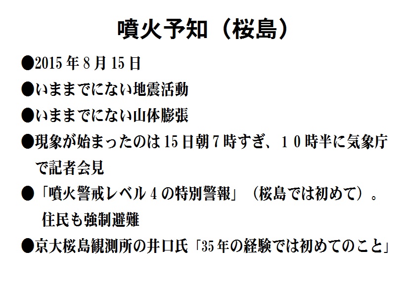 【島村】ごく最近2015年8月15日になっても、桜島では今までにない地震活動及び山体膨張があった。15日朝7時すぎに現象が始まった。10時半に気象庁で緊急記者会が開かれた。いままでにない地震活動で、いままでにない山体膨張で、「噴火警戒レベル4の特別警報」(桜島では初めて)として、警報レベルを引き上げて、住民も強制避難を行った。しかし、結局は何も起こらなかった。京大桜島観測所の井口氏は「35年の経験では初めてのこと」ということを言ったのですが、結局は、噴火しないまま終わってしまいました。