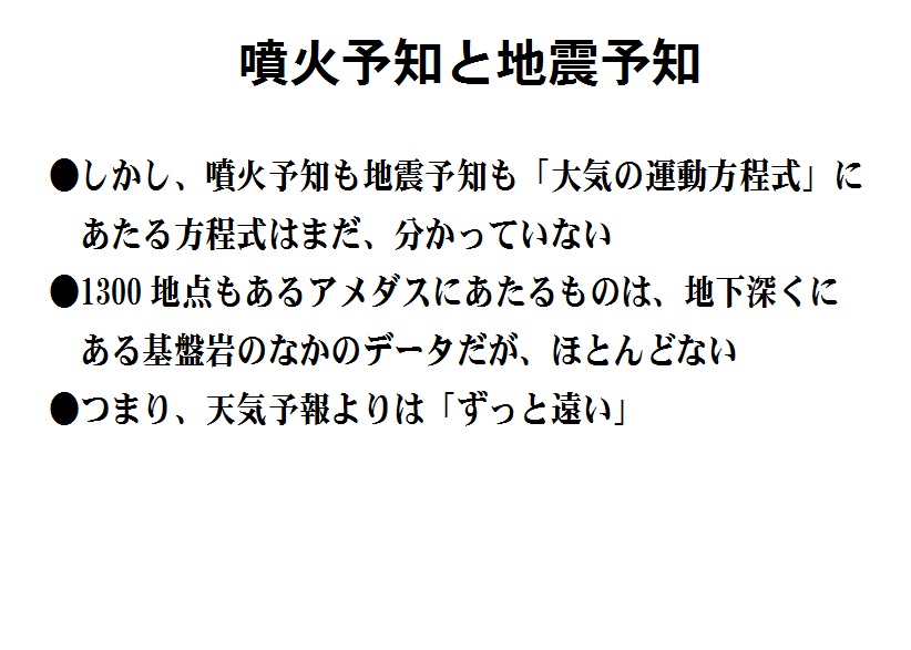 【島村】しかし、噴火予知も地震予知も「大気の運動方程式」にあたる方程式はまだ出来ていません。これがひとつ。1300地点もあるアメダスにあたるものは、地下深くにある基盤岩のなかのデータだが、ほとんどありません。首都圏でも、非常に微々たるものです。しかも方程式がないということで、天気予報よりは「ずっと遠い」というのが噴火予知と地震予知の現状です。