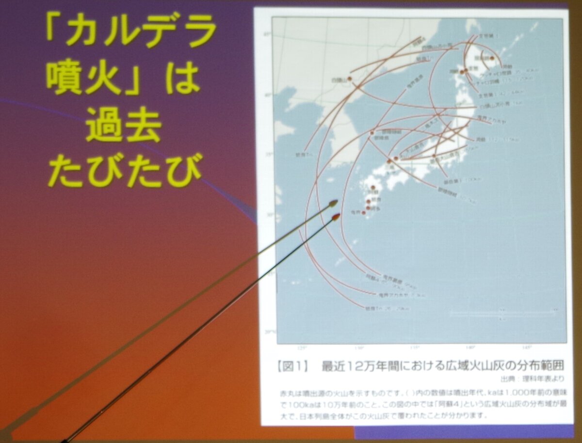 【島村】日本に「カルデラ噴火」が随分たくさんあることを示す図がこれです。この赤い線が火山灰が降った範囲、赤い丸が火山の場所です。伯耆大山、これは今は活火山ではありませんが、そういった意味では伯耆大山も「カルデラ噴火」したこともあります。白頭山でも「カルデラ噴火」があり、北海道の支笏でも「カルデラ噴火」をして、その火山灰が、今度の胆振東部の地震で崩壊したということがありました。九州でくり返し起きた「カルデラ噴火」により、九州全体にシラス台地をもたらしています。