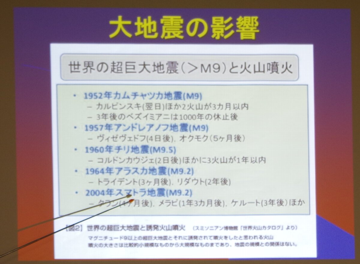 【島村】M9を超える地震はモーメント・マグニチュード(Mw)で計算しますので、地震計が近代的になってから分かるようになってきました。1960年ごろから、Mwで計算できるようになった。環太平洋では、東北地方太平洋沖地震を含めて、M9を超える地震は7つ(※)知られています。東北地方太平洋沖地震のぞいた地震は全て、地震から数年後もしく数10年後の間に、近くで大きな火山の噴火があります。中には1000年の休止後といったものもあります。
