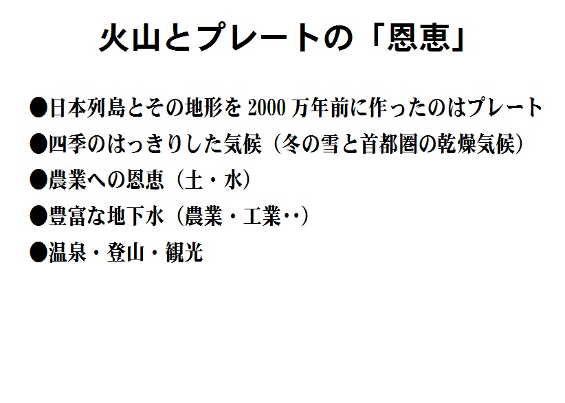 【島村】日本列島とその地形を2000万年前に作ったのはプレートです。四季のはっきりした気候(冬の雪と首都圏の乾燥気候)もプレートが作ってくれたものです。農業への「恩恵」(土・水)があります。豊富な地下水(農業・工業・・)という「恩恵」があります。温泉・登山・観光等の「恩恵」もあります。