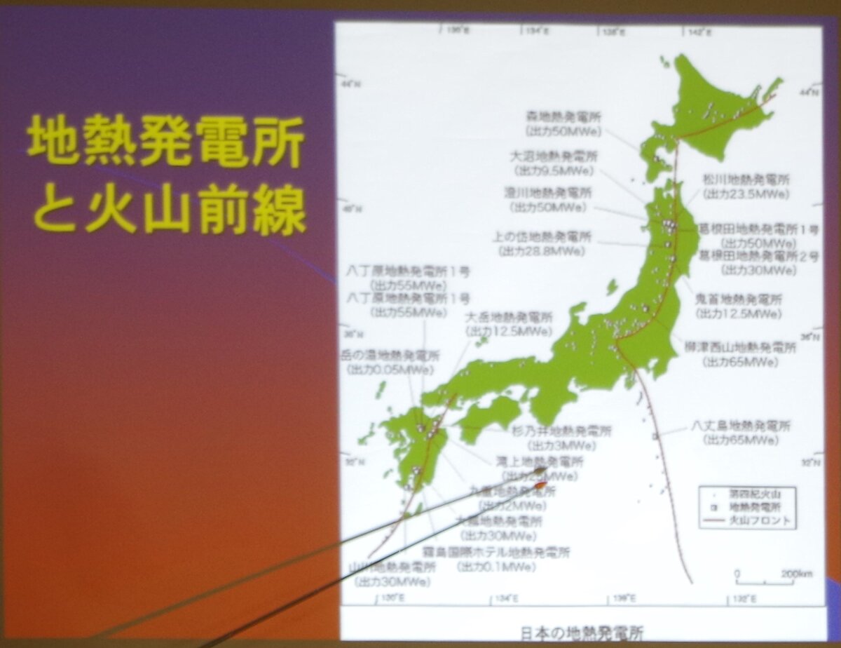 【島村】地熱発電というもあります。地熱発電所は火山フロント(前線)にほぼそって分布しています。風力や太陽光発電とちがって天候に影響されません。そういった意味では一日中、一年中、出力が高くたもたれる。ただ、二つの問題もありまして、一つは国立公園の中での開発が許可されない、ボーリングをしていけないということです。もう一つは温泉業者がそこにある温泉が涸れてしまうのではないかということで反対しています。ここ数年で変わりまして、国立公園の外から斜めにボーリングも可能となっています。地熱発電は、いままでよりは増えると思います。