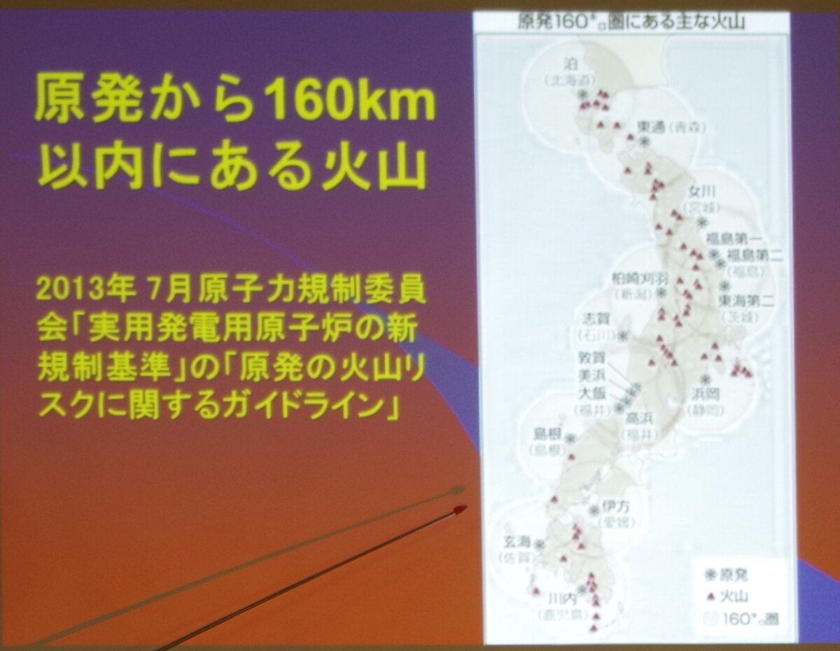 【島村】これは2013年7月原子力規制委員会「実用発電用原子炉の新規制基準」の「原発の火山リスクに関するガイドライン」から作成された図です。原発160km圏にある主な火山を示します。これをみると、すべての原発が火山の160km圏内にあることになります。