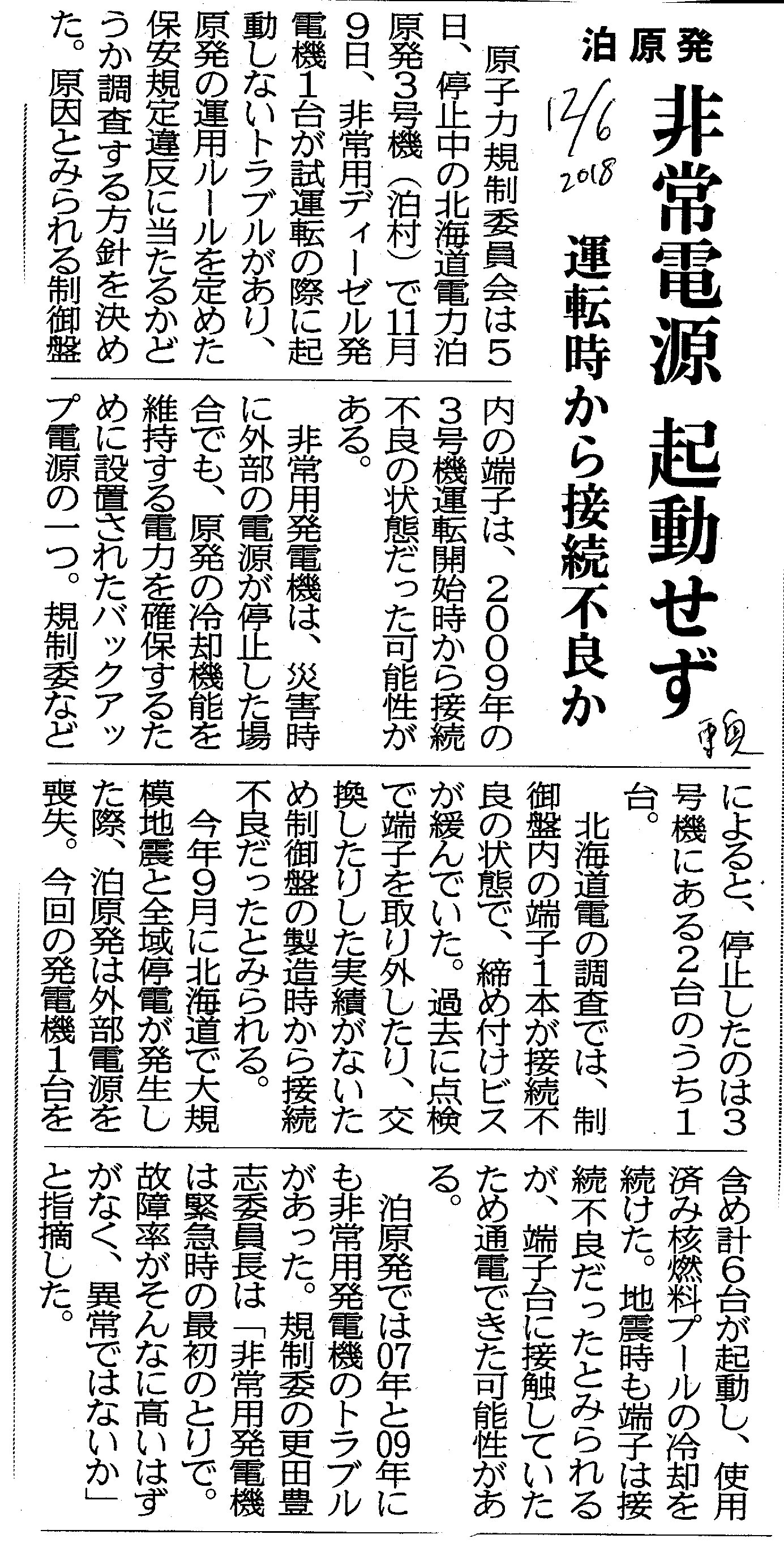 | [2018_12_06_05]泊原発 非常電源 起動せず 運転時から接続不良か(東奥日報2018年12月6日) |