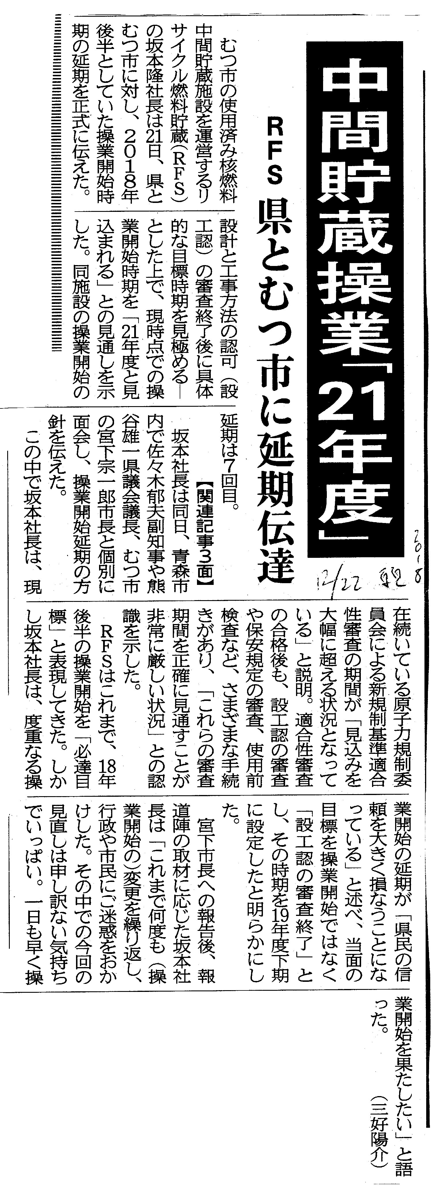 | [2018_12_22_04]中間貯蔵操業「21年度」 RFS 県とむつ市に延期伝達(東奥日報2018年12月22日) |