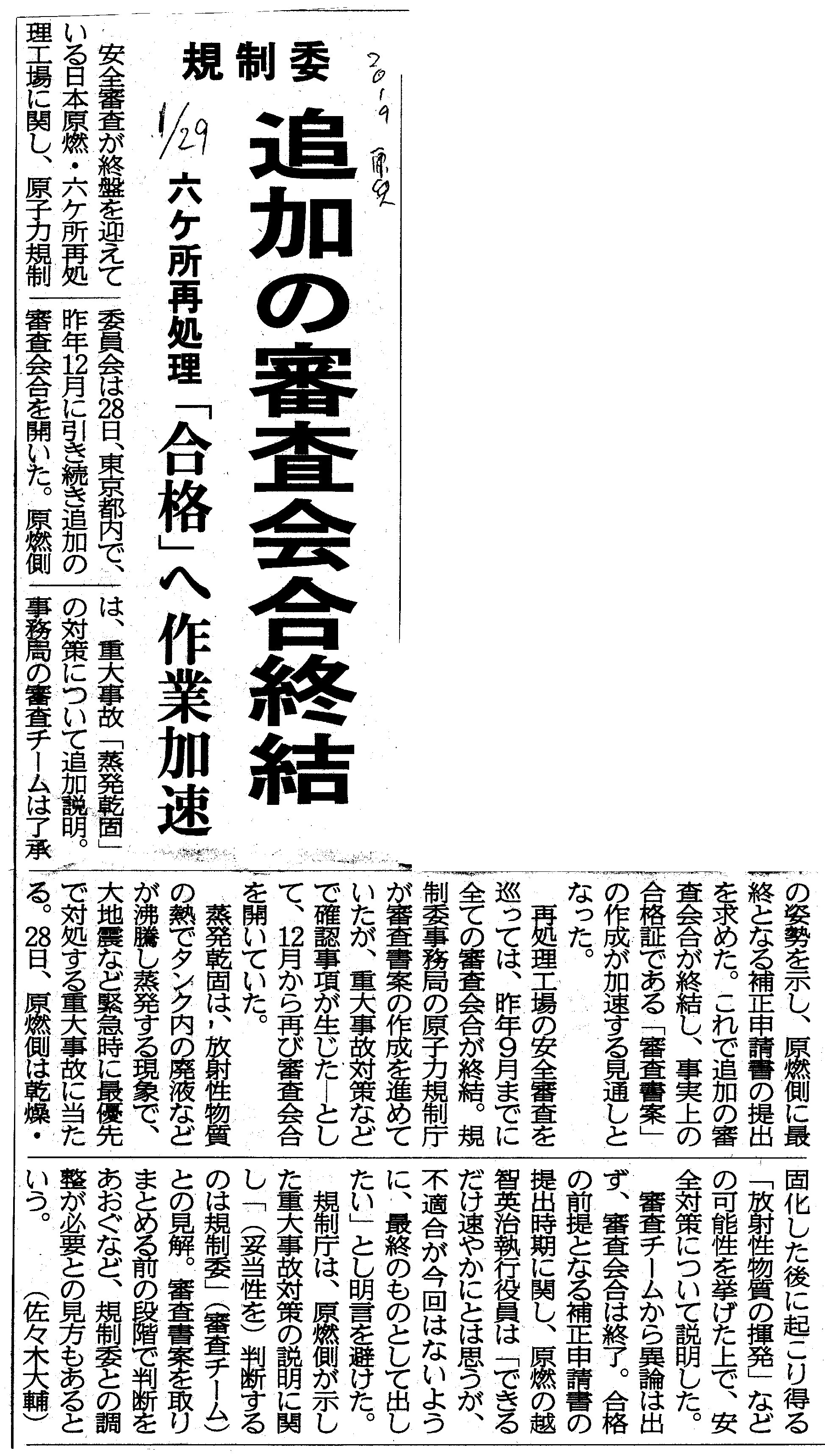 | [2019_01_29_03]規制委 追加の審査会合終結 六ケ所再処理「合格」へ作業加速(東奥日報2019年1月29日) |