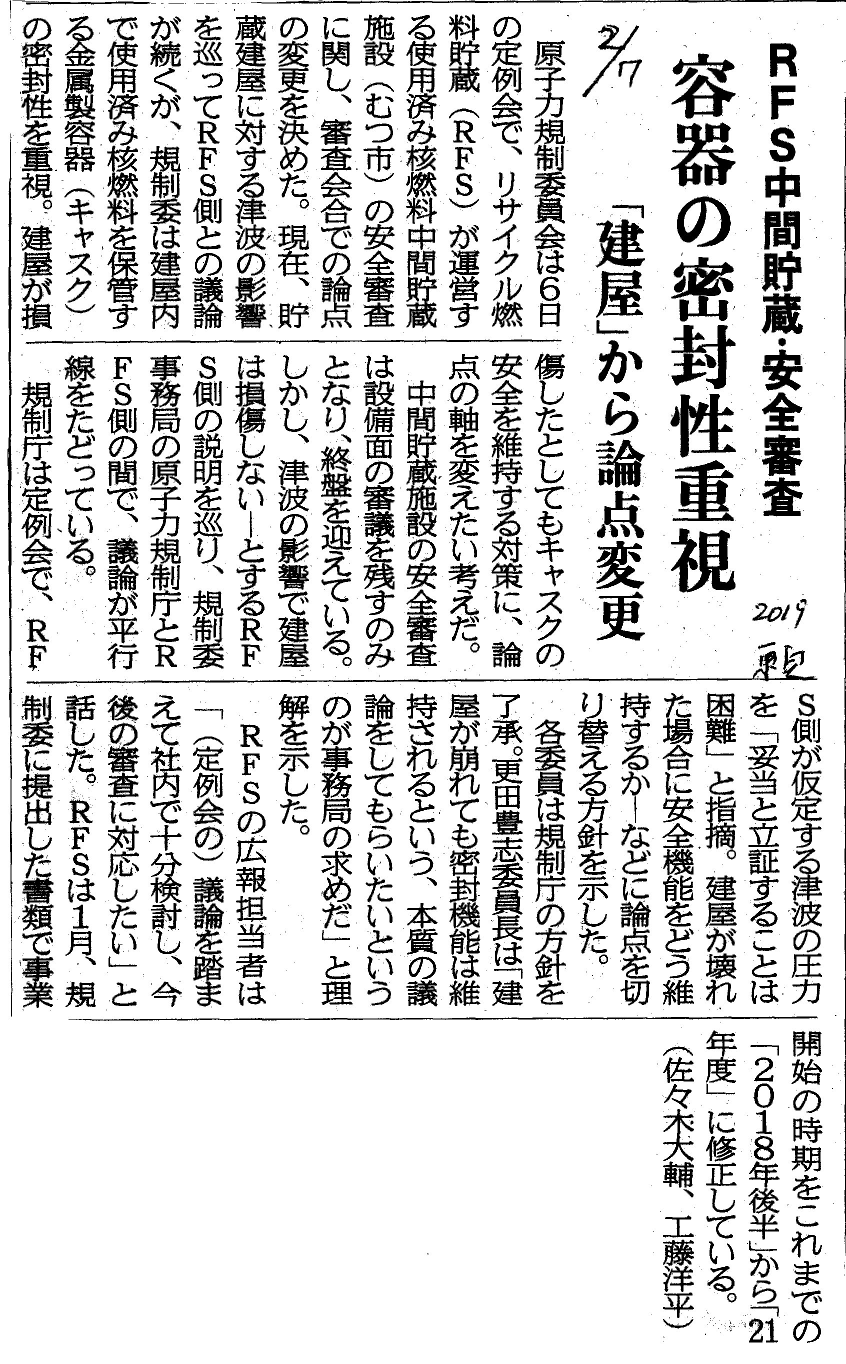 | [2019_02_07_03]RFS中間貯蔵・安全審査 容器の密封性重視 「建屋」から論点変更(東奥日報2019年2月7日) |