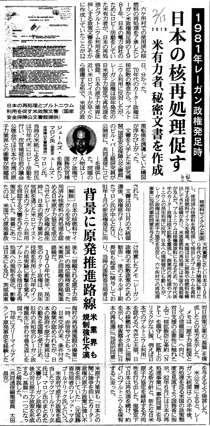 | [2019_02_13_05]1981年レーガン政権発足時 日本の核再処理促す 米有力者、秘密文書を作成 背景に原発推進路線 米業界も規制強化不満(東奥日報2019年2月13日) |