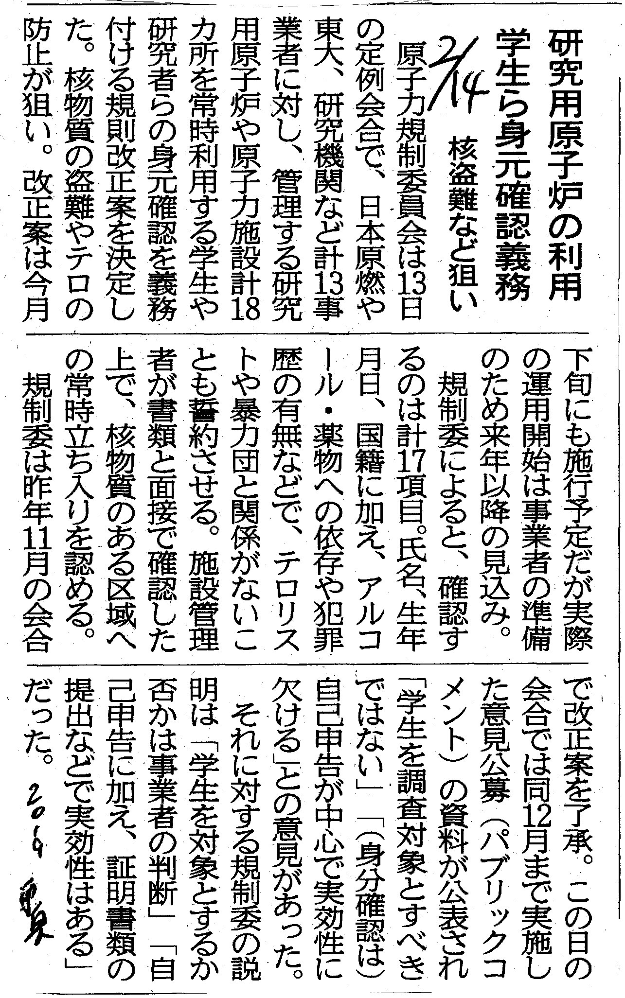 [2019_02_14_05]研究用原子炉の利用 学生ら身元確認義務 核盗難など狙い(東奥日報2019年2月14日)