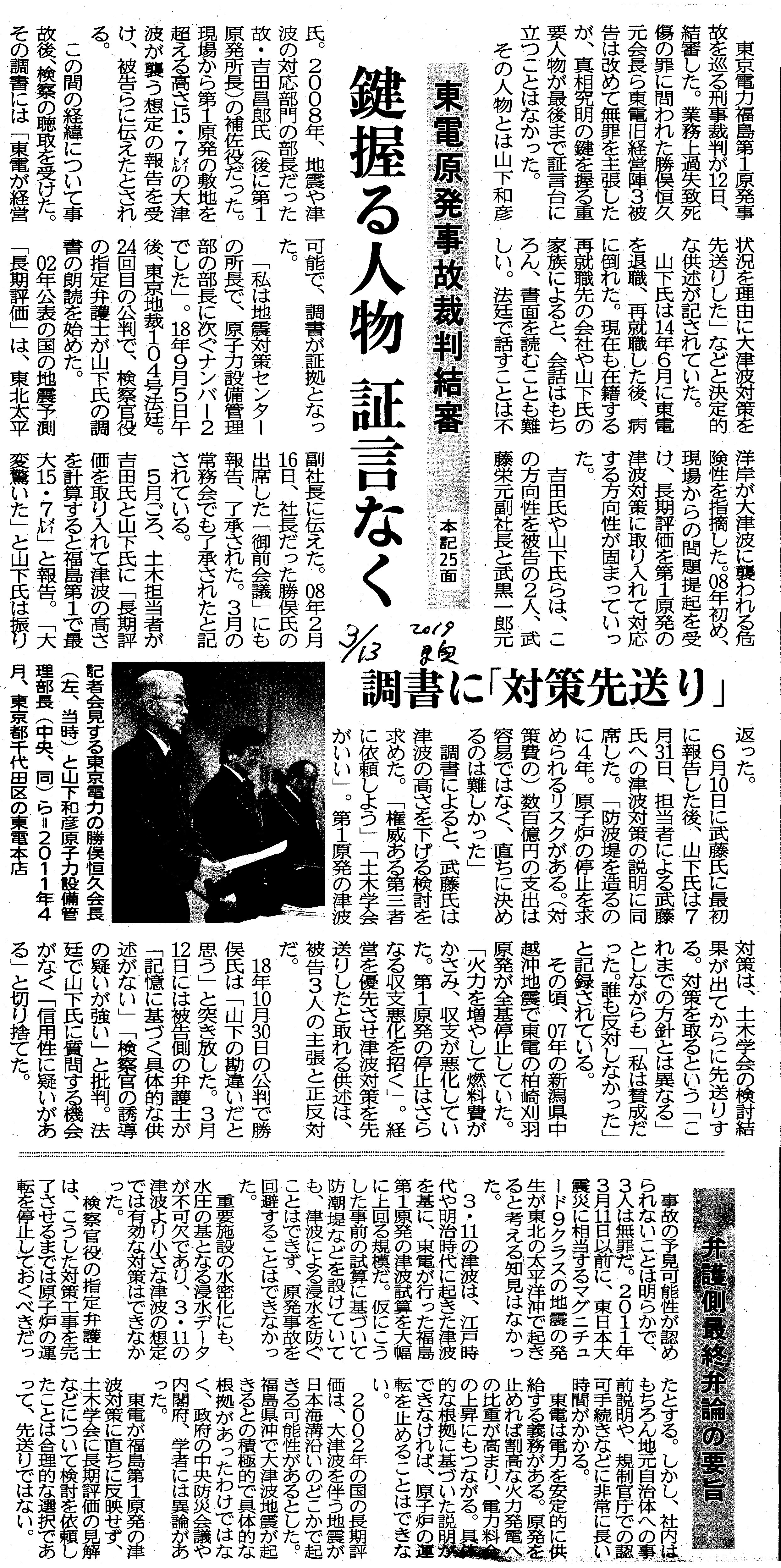 [2019_03_13_04]東電原発事故裁判結審 鍵握る人物 証言なく 調書に「対策先送り」 弁護側最終弁論の要旨(東奥日報2019年3月13日)