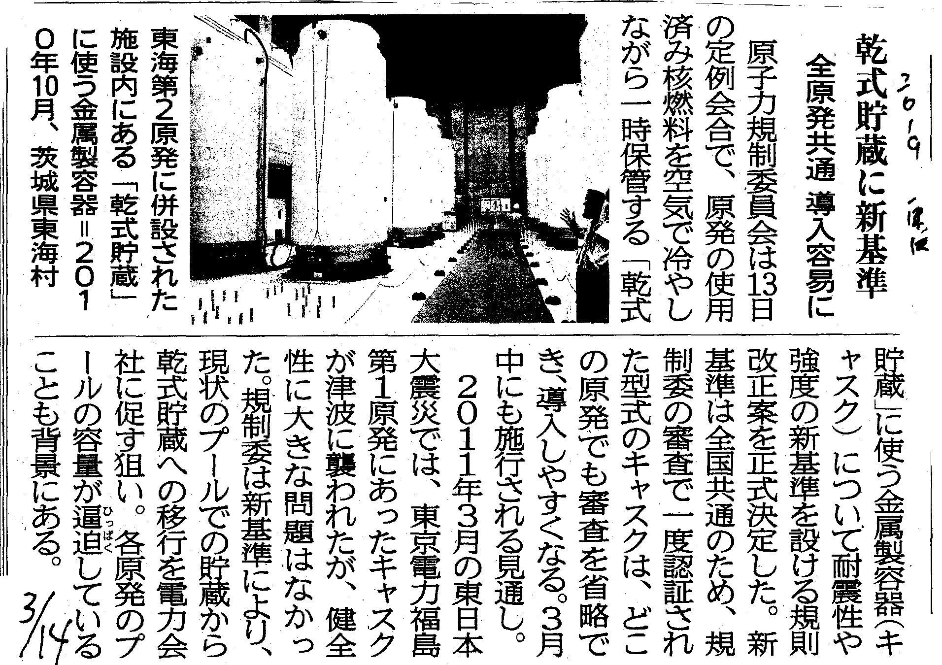 [2019_03_14_04]乾式貯蔵に新基準 全原発共通 導入容易に(東奥日報2019年3月14日)