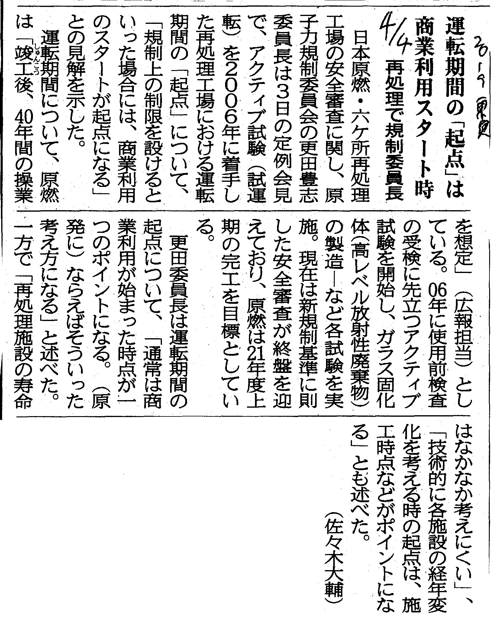 | [2019_04_04_05]運転期間の「起点」は商業利用スタート時 再処理で規制委員長(東奥日報2019年4月4日) |