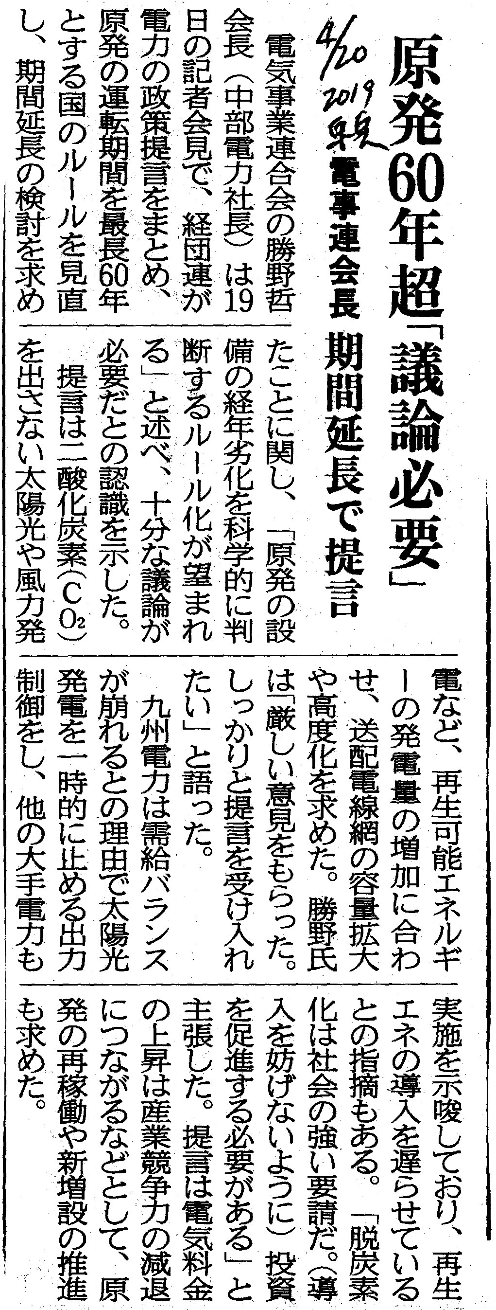 [2019_04_20_01]原発60年超「議論必要」 電事連会長 期間延長で提言(東奥日報2019年4月20日)
