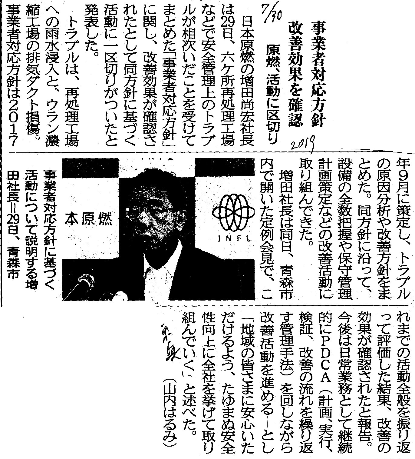 | [2019_07_30_03]事業者対応方針 改善効果を確認 原燃、活動に区切り(東奥日報2019年7月30日) |