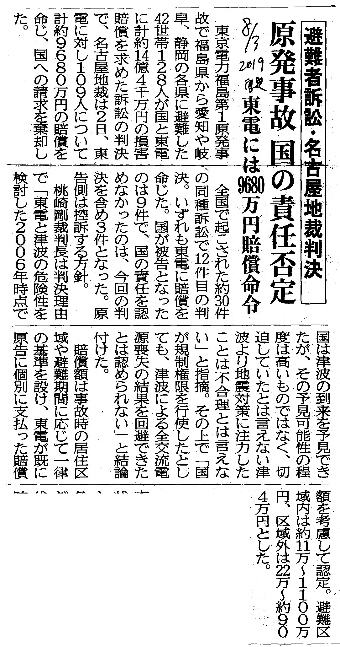 [2019_08_03_03]避難者訴訟・名古屋地裁判決 原発事故 国の責任否定 東電には9680万円賠償命令(東奥日報2019年8月3日)