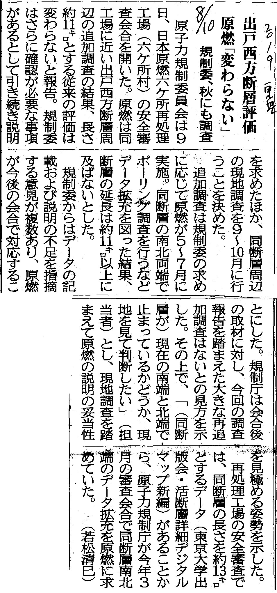 | [2019_08_10_01]出戸西方断層評価 原燃「変わらない」 規制委、秋にも調査(東奥日報2019年8月10日) |