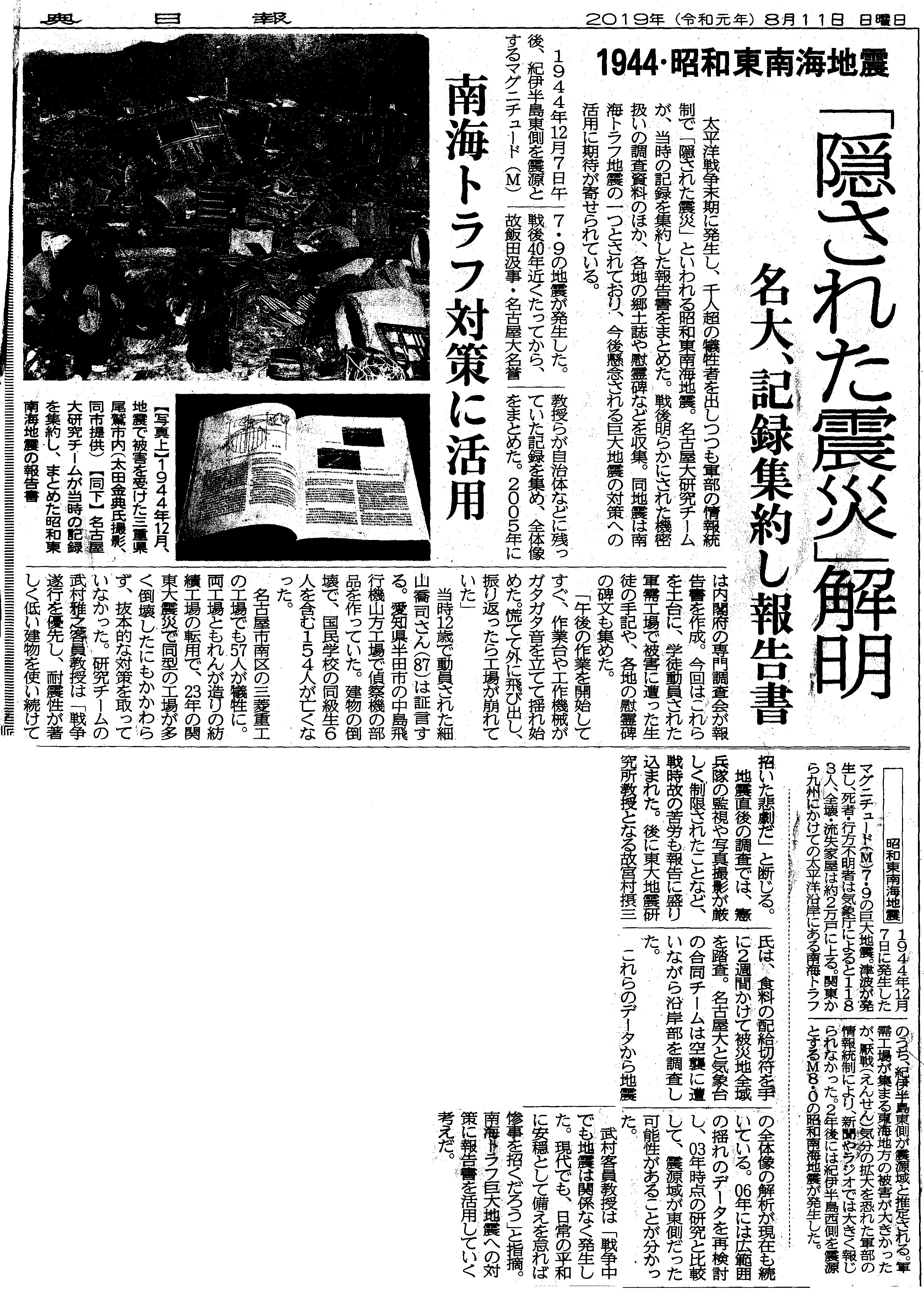 [2019_08_11_01]1944・昭和東南海地震 「隠された震災」解明 名大、記録集約し報告書 南海トラフ対策に活用(東奥日報2019年8月11日)