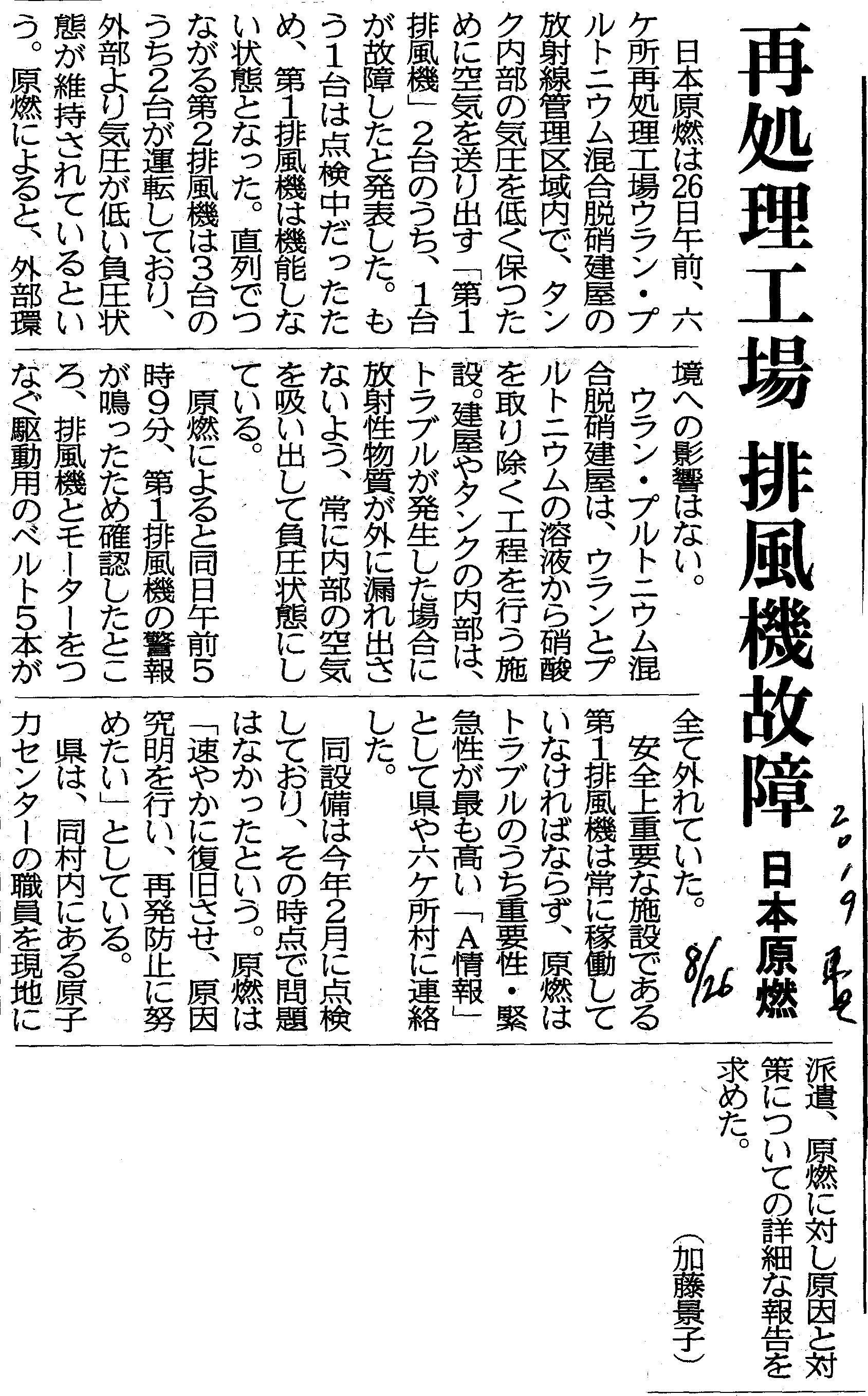 | [2019_08_26_04]再処理工場 排風機故障 日本原燃(東奥日報2019年8月26日) |