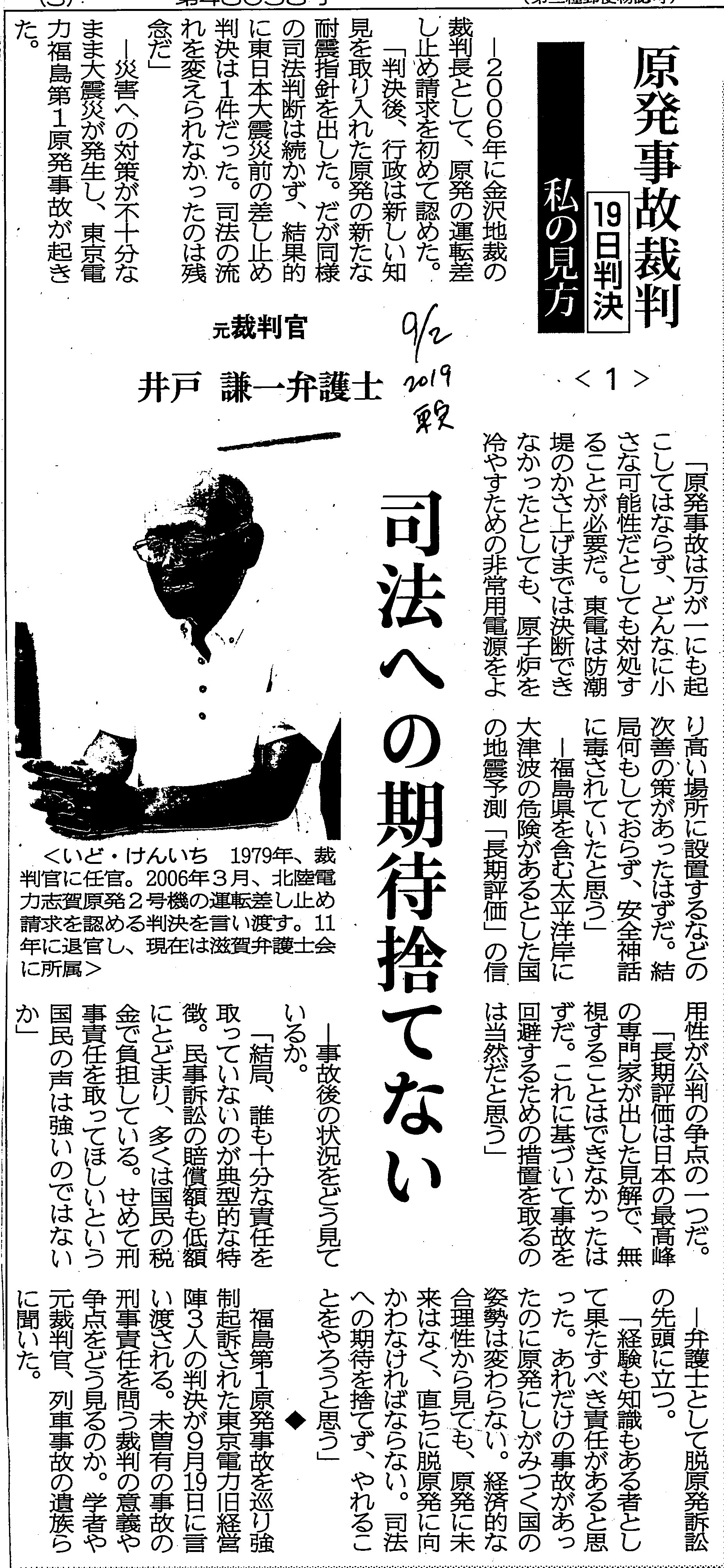 [2019_09_02_06]原発事故裁判 19日判決 私の見方 <1> 元弁護士 井戸謙一弁護士 司法への期待捨てない(東奥日報2019年9月2日)