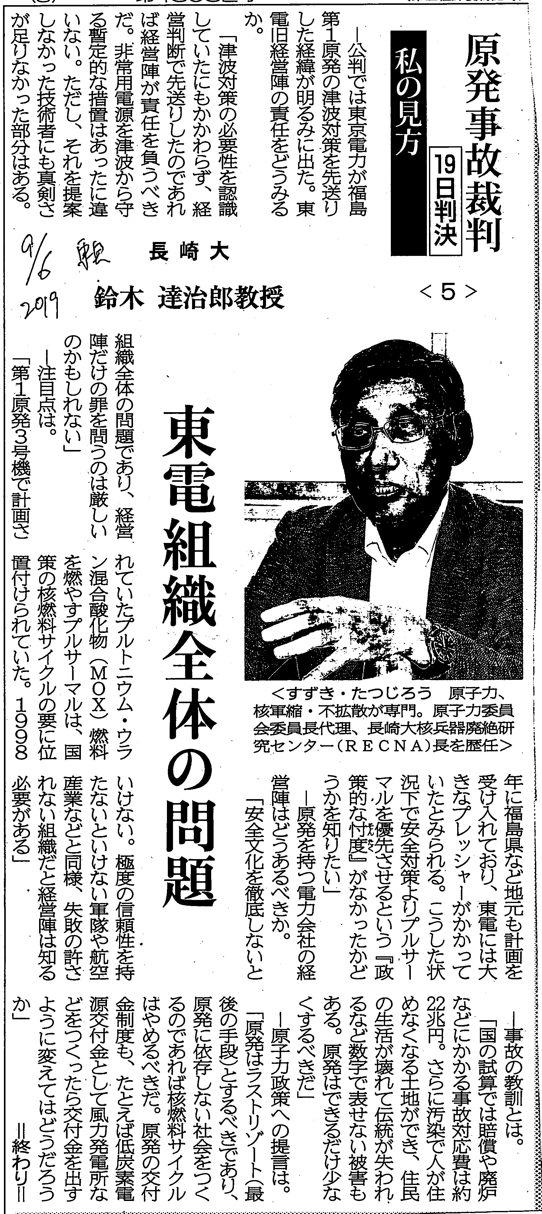 [2019_09_06_04]原発事故裁判 19日判決 私の見方 <5> 長崎大 鈴木達治郎教授 東電組織全体の問題(東奥日報2019年9月6日)