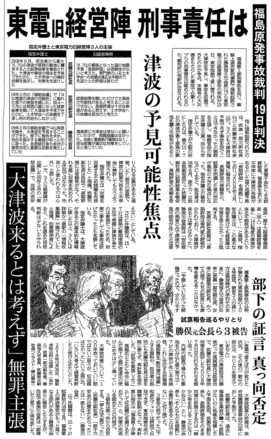| [2019_09_07_06]福島原発事故19日判決 東電旧経営陣 刑事責任は 津波の予見可能性焦点 「大津波来るとは考えず」無罪主張 部下の証言 真っ向否定 試算報告巡るやりとり 勝俣元会長ら3被告(東奥日報2019年9月7日) |