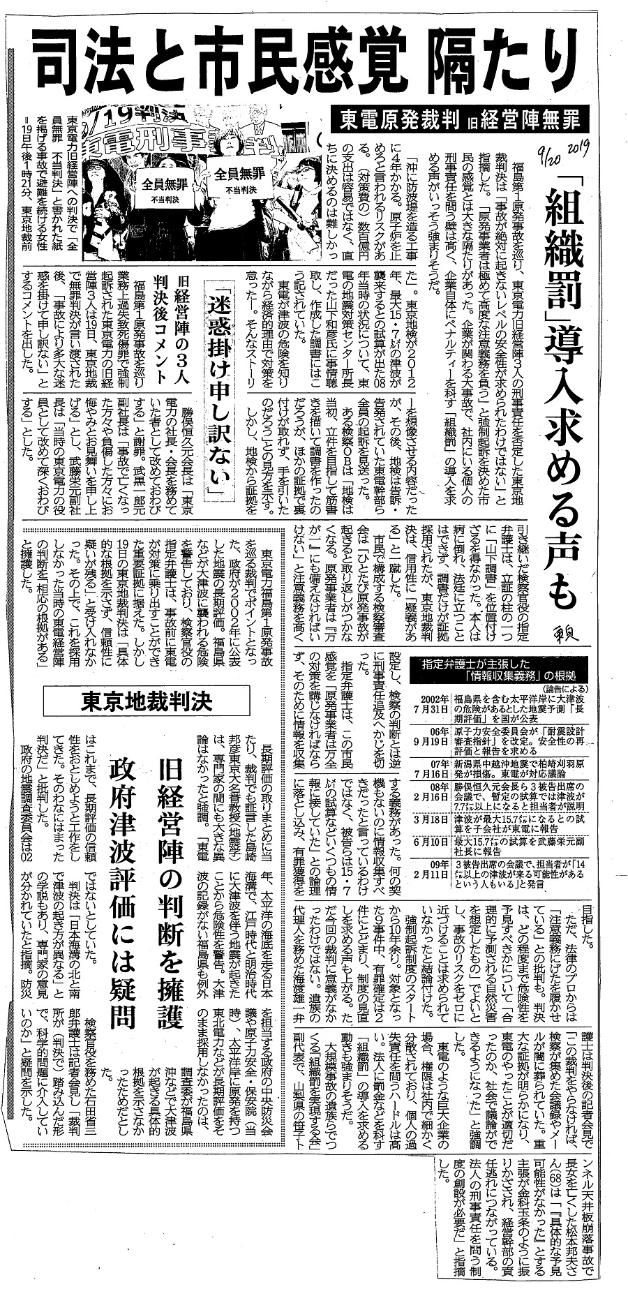 | [2019_09_20_12]東電原発裁判 旧経営陣無罪 司法と市民感覚 隔たり 「組織罰」 導入求める声も 迷惑かけ申し訳ない 旧経営陣の3人 判決後コメント 東京地裁判決 旧経営陣の判断を擁護 政府津波評価には疑問(東奥日報2019年9月20日) |