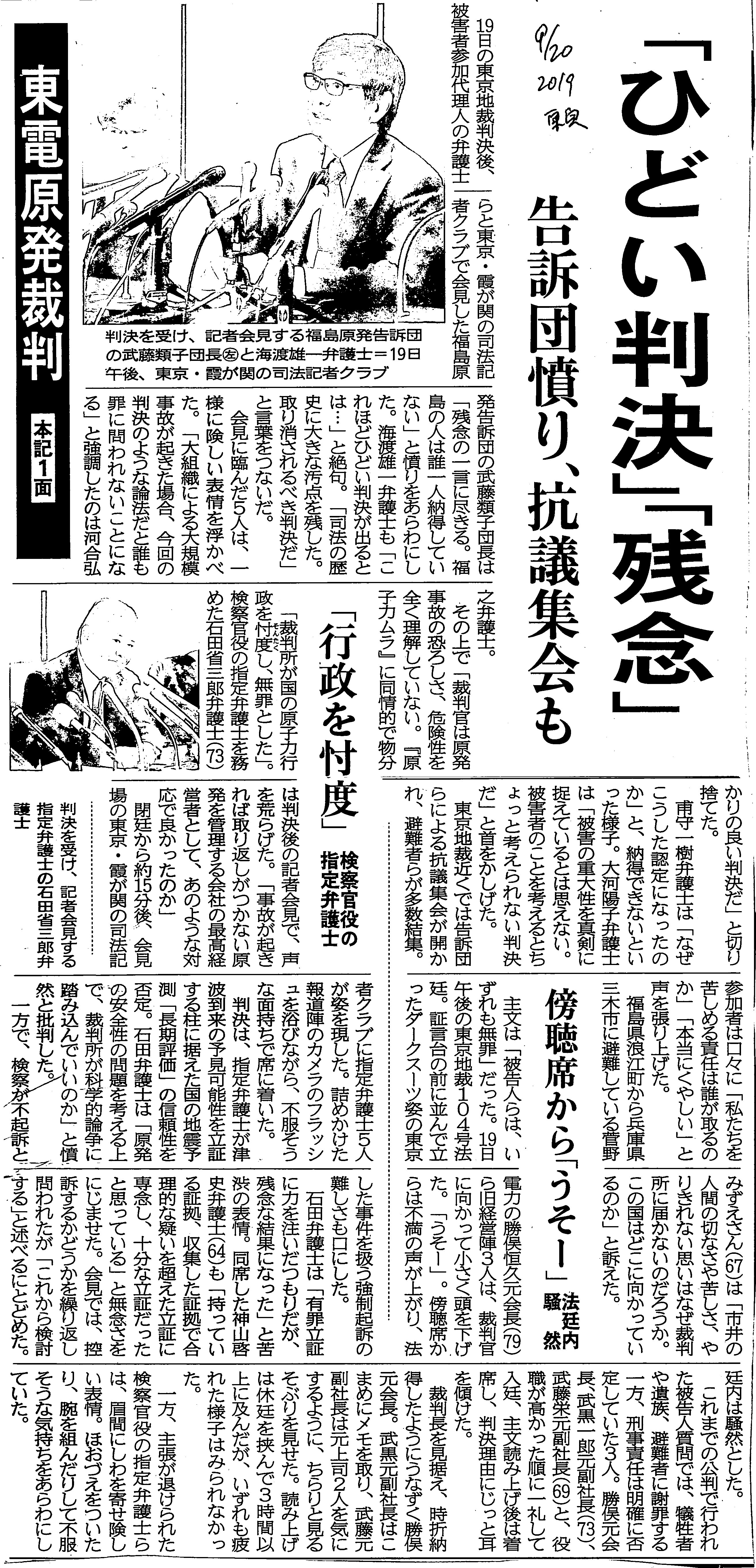 [2019_09_20_14]東電原発裁判 「ひどい判決」「残念」 告訴団憤り、抗議集会も 傍聴席から「うそー」法廷内騒然 「行政を忖度」 検察官役の指定弁護士(東奥日報2019年9月20日)