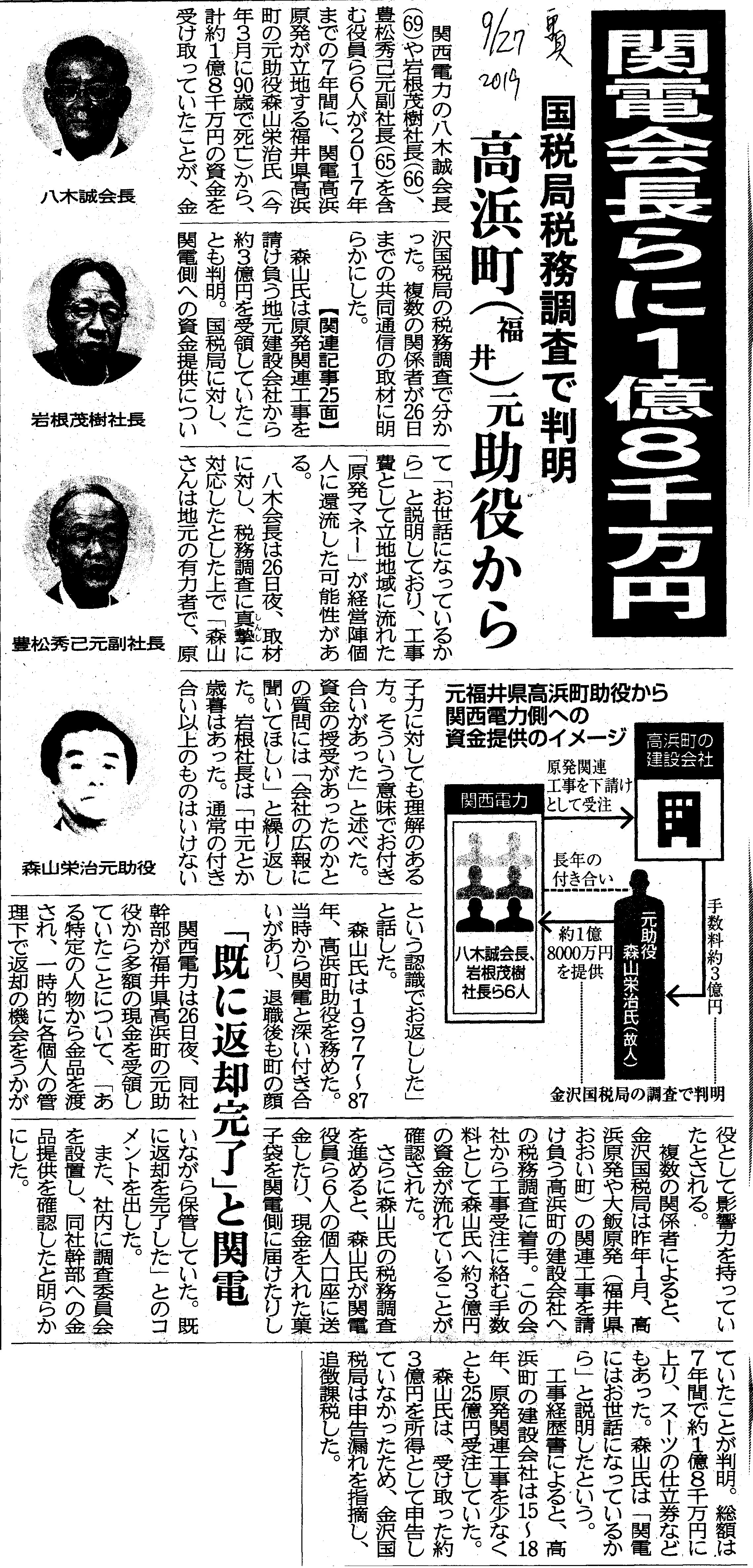 [2019_09_27_13]関電会長らに1億8千万円 国税局税務調査で判明 高浜町(福井)元助役から 「既に返却完了」と関電(東奥日報2019年9月27日)