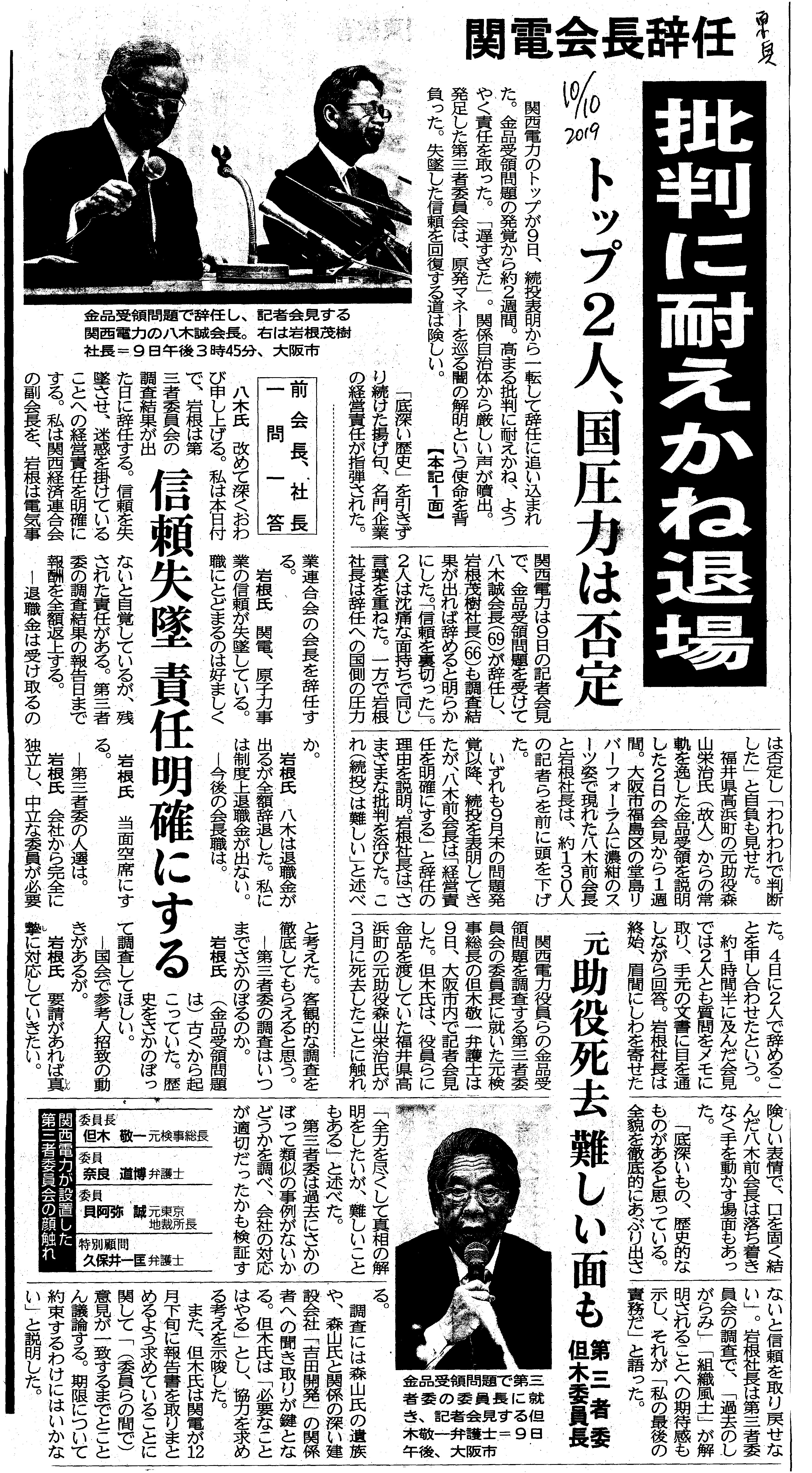 [2019_10_10_01]関電会長辞任 批判に耐えかね退場 トップ2人、国圧力は否定 前会長、社長一問一答 信頼失墜 責任明確にする 元助役死去 難しい面も 第三者委但木委員長(東奥日報2019年10月10日)