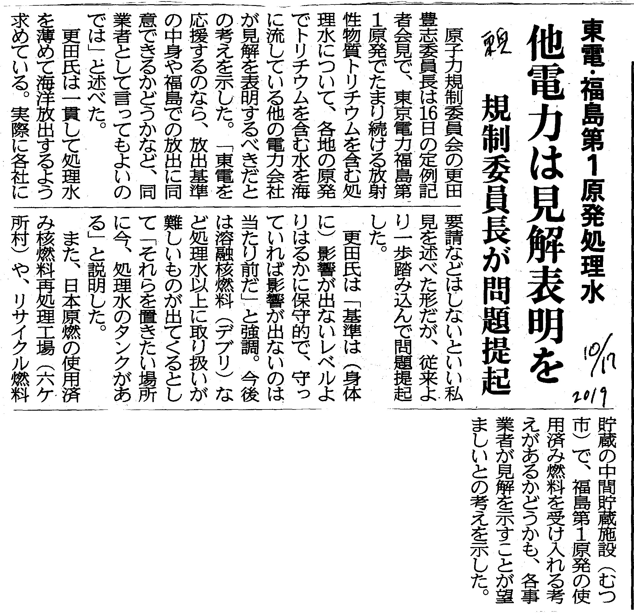 | [2019_10_17_04]東電・福島第1原発処理水 他電力は見解表明を 規制委員長が問題提起(東奥日報2019年10月17日) |