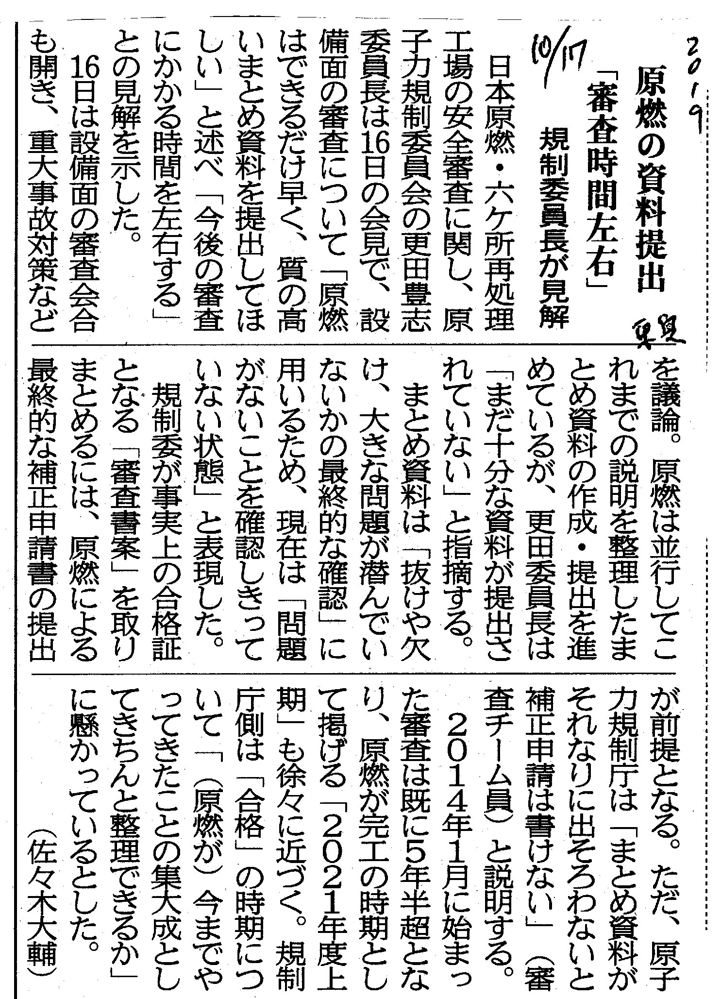 | [2019_10_17_06]原燃の資料提出 「審査時間左右」 規制委員長が見解(東奥日報2019年10月17日) |