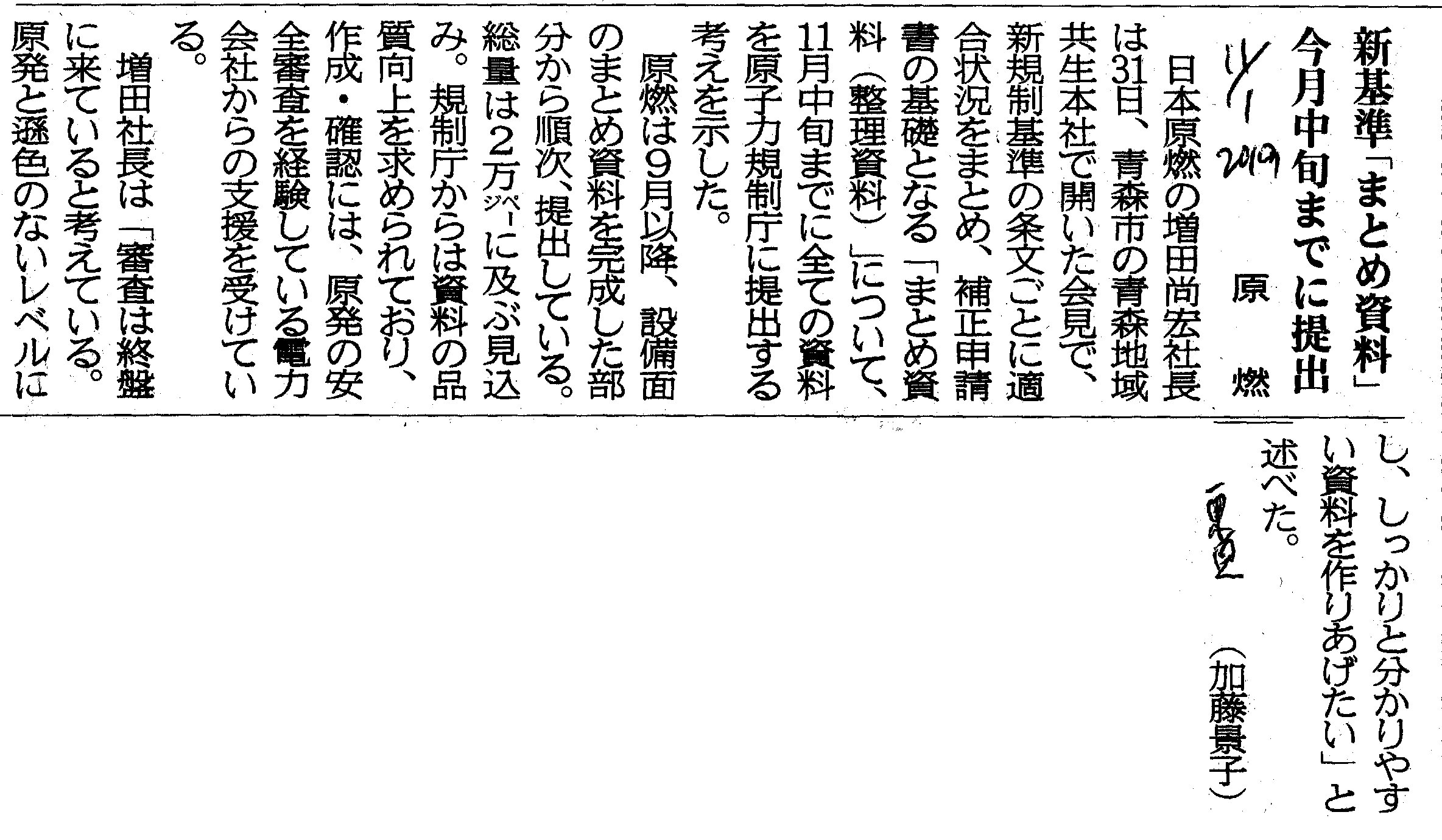 | [2019_11_01_03]新基準「まとめ資料」今月中旬までに提出 原燃(東奥日報2019年11月1日) |