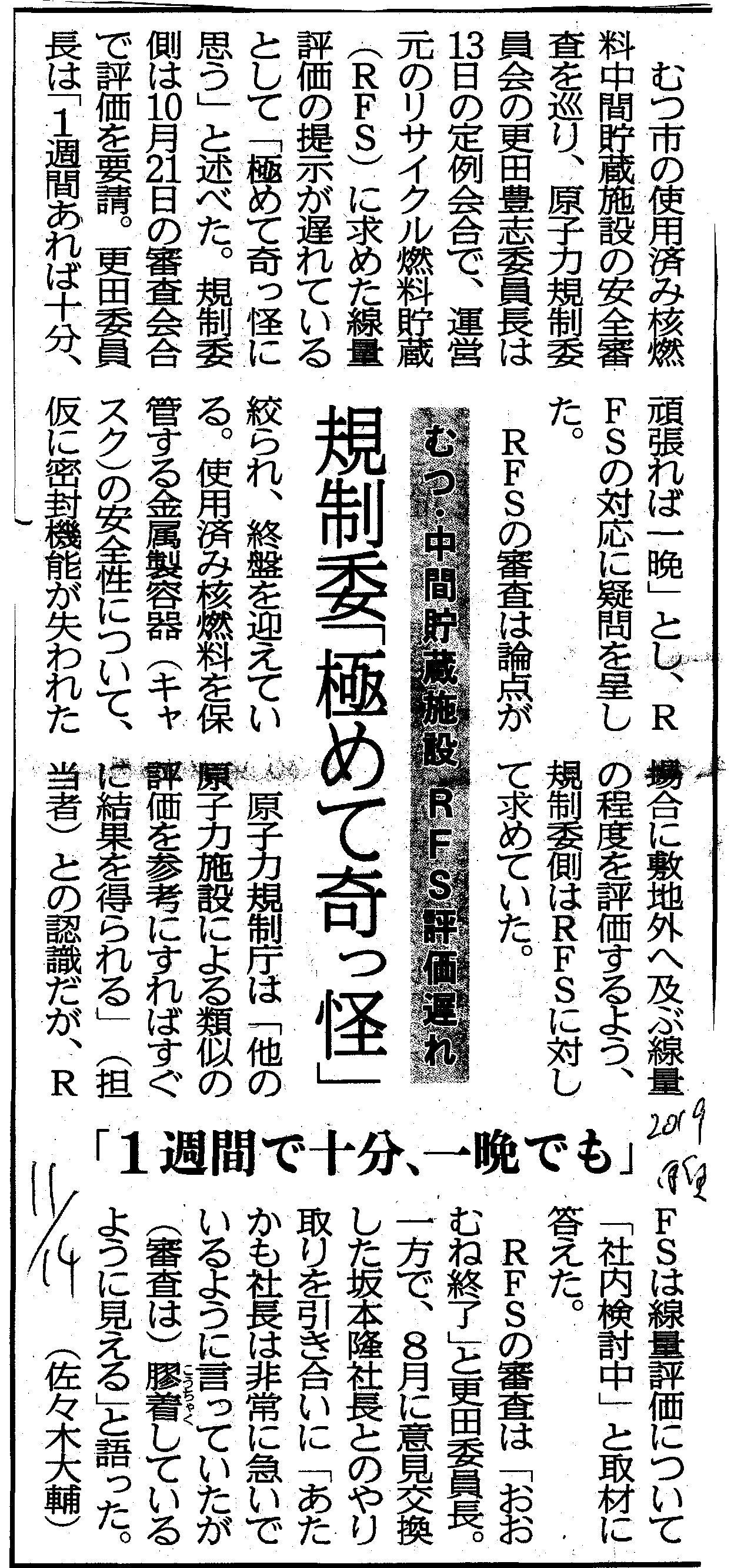 | [2019_11_14_01]むつ・中間貯蔵施設 RFS評価遅れ 規制委「極めて奇っ怪」 「1週間で十分、一晩でも」(東奥日報2019年11月14日) |