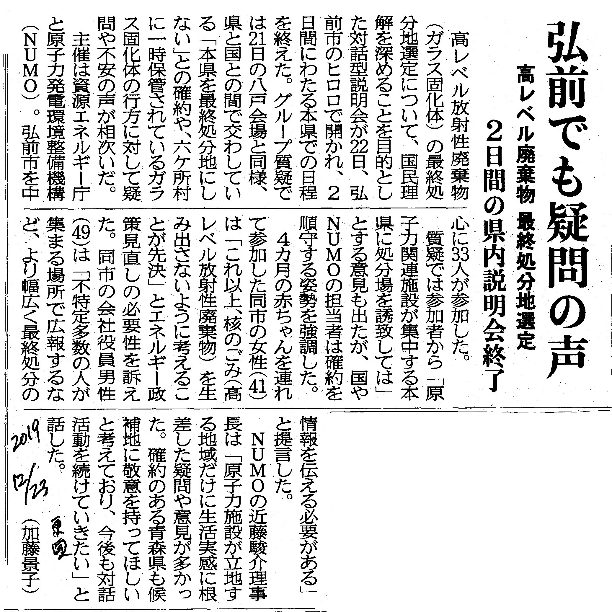 | [2019_12_23_03]弘前でも 疑問の声 高レベル廃棄物 最終処分地選定 2日間の県内説明会終了(東奥日報2019年12月23日) |