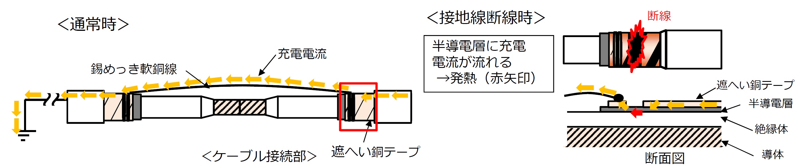 損傷のあった接続部の分解調査の結果、接続部の端部「接地線取り付け部」付近が著しく溶損しており、接地線に不具合があったと推定。