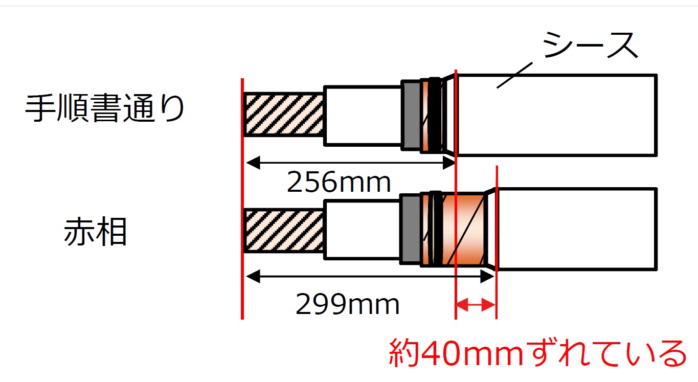 赤相の接続部について寸法測定を行った結果、シース端部が手順書通りの位置よりもケーブル側にずれていることを確認したことから、シュリンクバック(※)していると推定