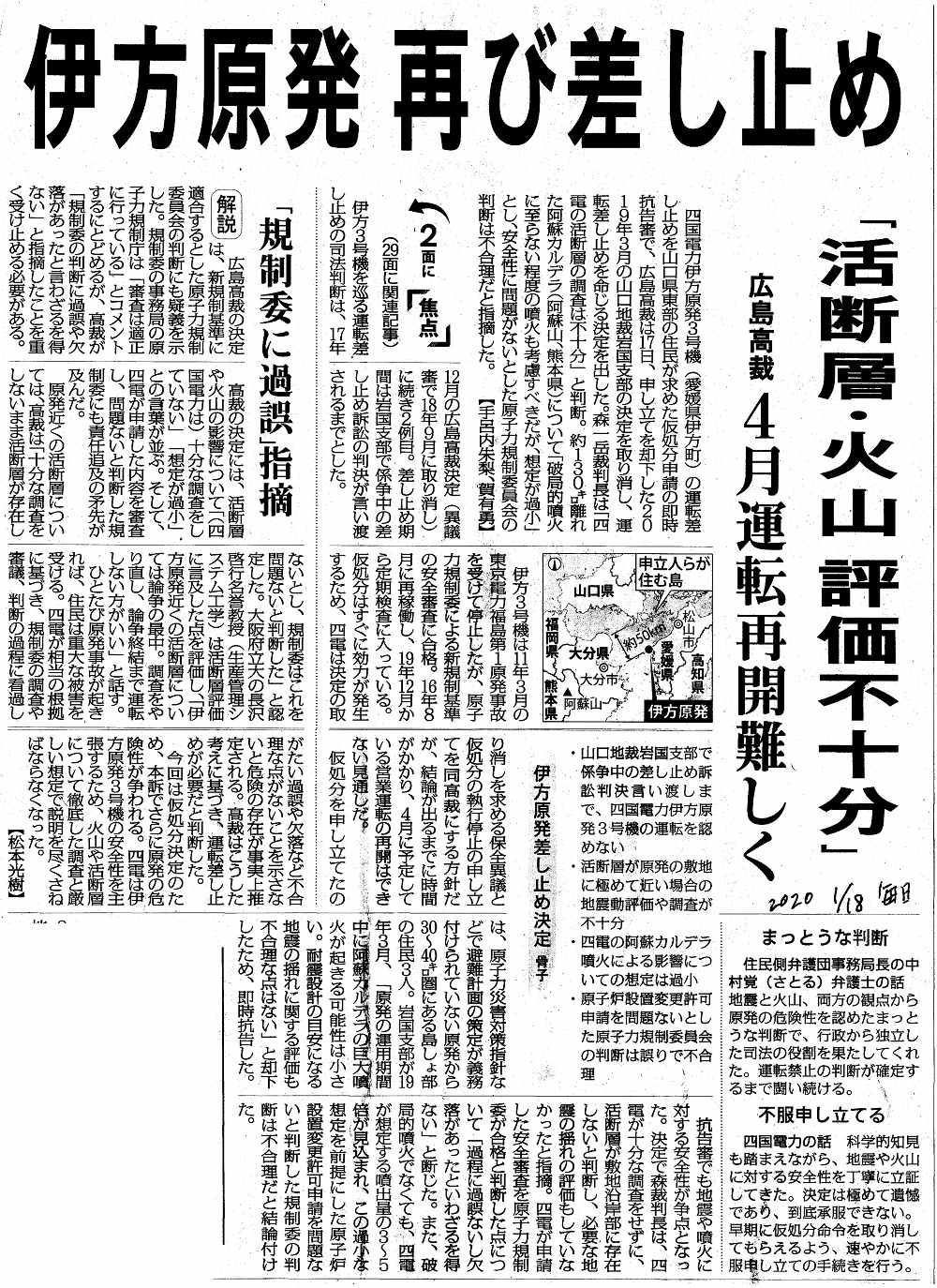 | [2020_01_18_05]伊方原発 再び差し止め 「活断層・火山 評価不十分」 広島高裁 4月運転再開難しく 「規制委に過誤」指摘 伊方原発差し止め決定骨子 まっとうな判断 不服申し立てる(毎日新聞2020年1月18日) |