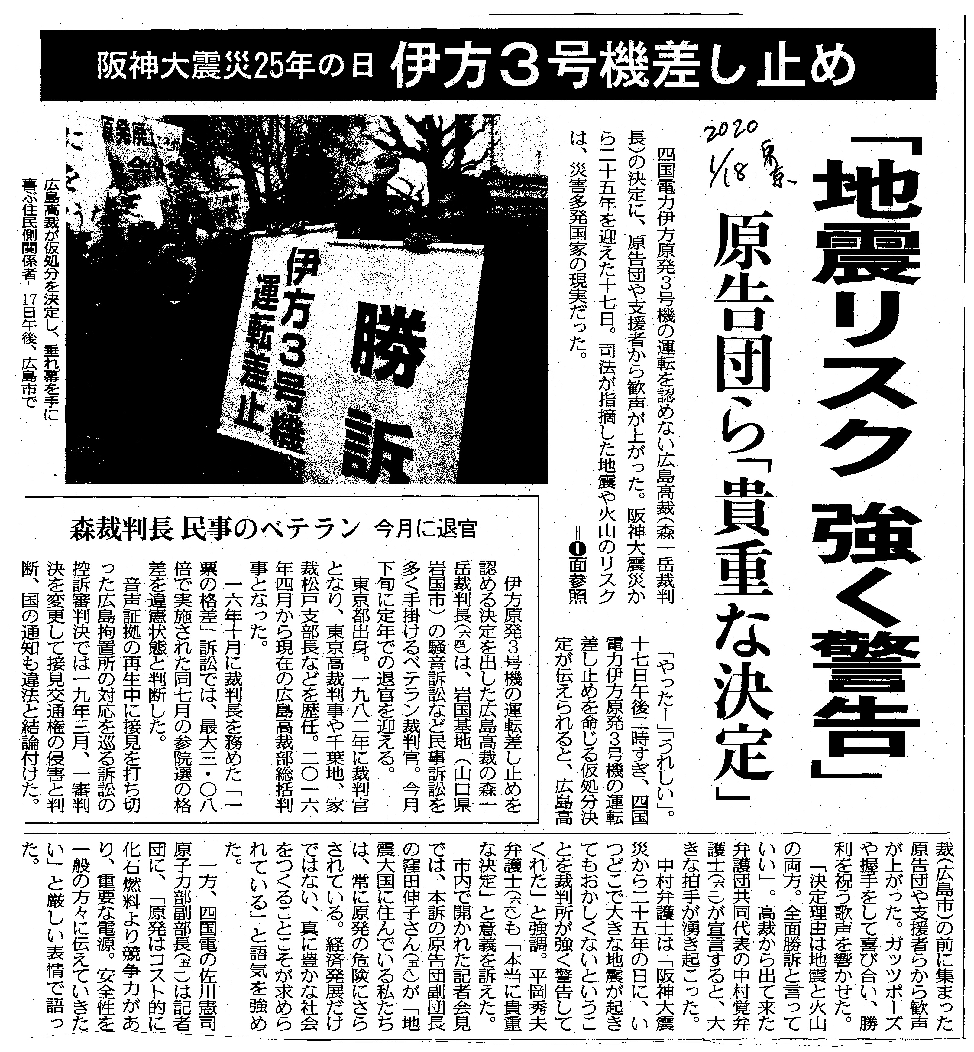 [2020_01_18_07]阪神大震災25年の日 伊方3号機差し止め 「地震リスク 強く警告」 原告団ら「貴重な決定」 森裁判長 民事のベテラン 今月に退官(東京新聞2020年1月18日)