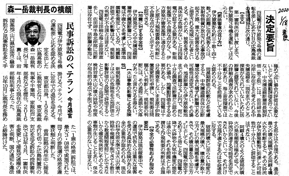 | [2020_01_18_08]決定要旨 【主文】【司法審査の在り方】【地震に対する安全性】【火山事象の影響による危険性】【保全の必要性および担保の要否】森一岳裁判長の横顔 民事訴訟のベテラン 今月退官(東奥日報2020年1月18日) |