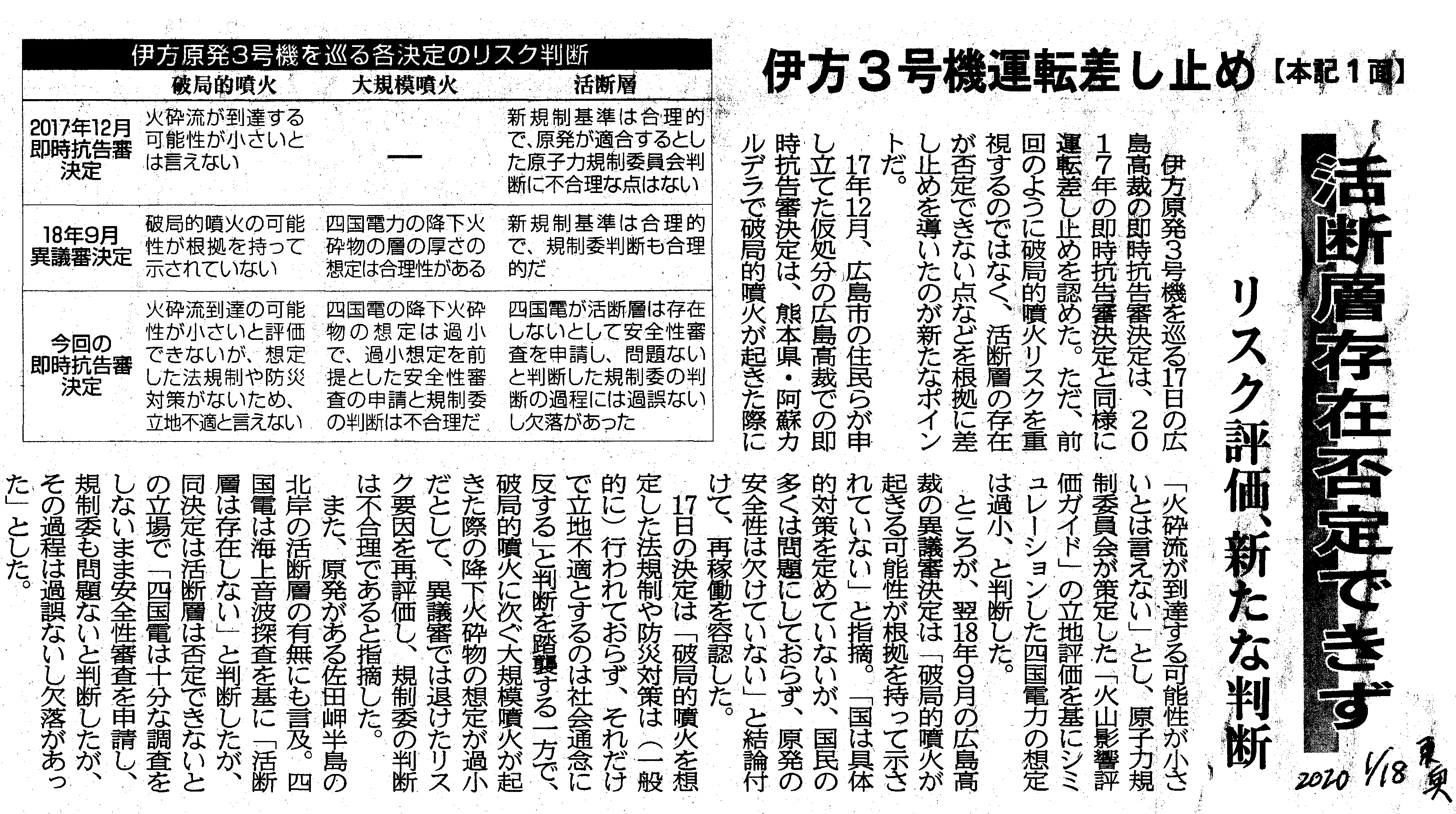 [2020_01_18_09]伊方3号機運転差し止め 活断層存在否定できず リスク評価、新たな判断 伊方原発3号機を巡る各決定のリスク判断 破局的噴火 大規模噴火 活断層(東奥日報2020年1月18日)
