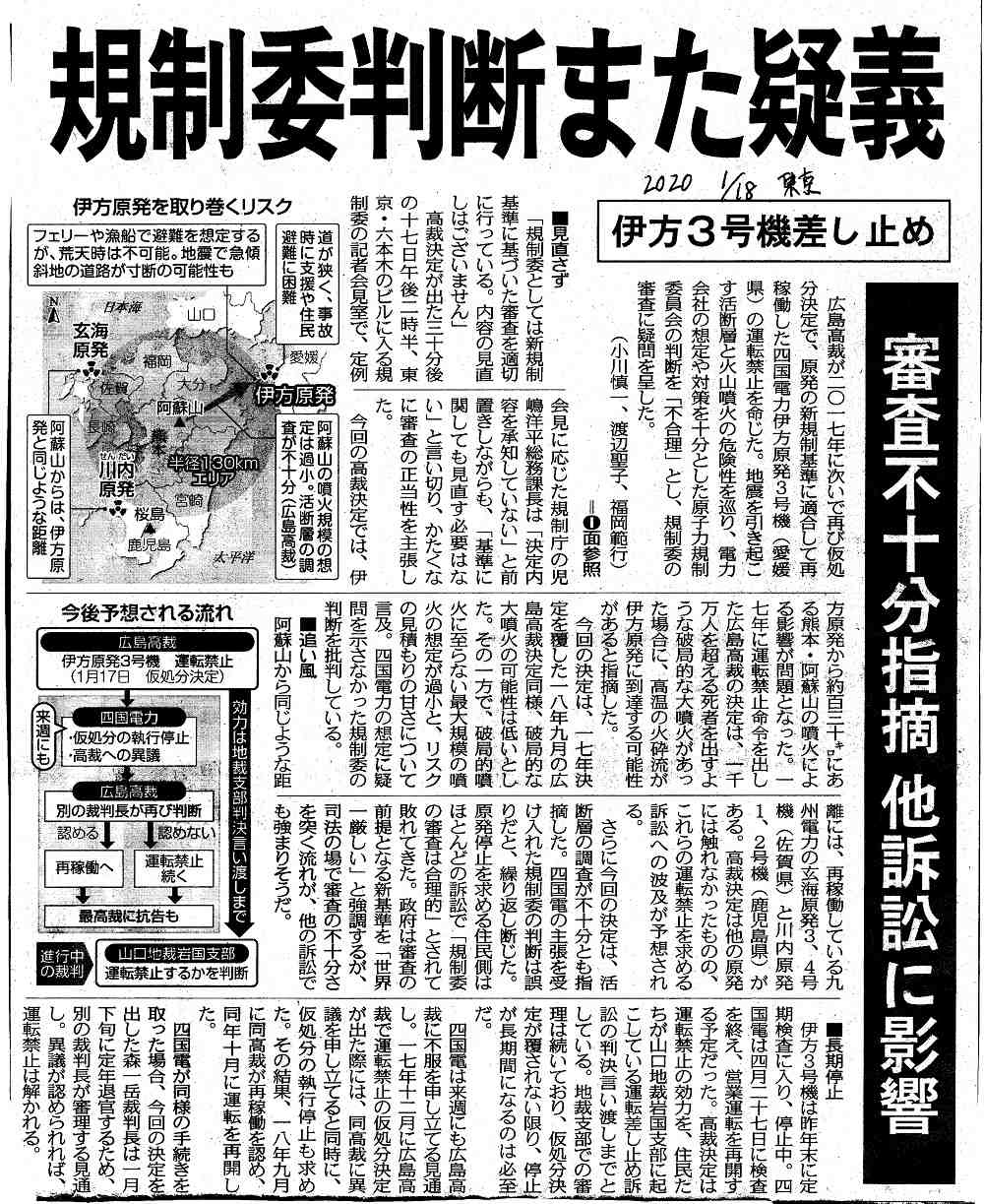 | [2020_01_18_10]規制委判断また疑義 伊方3号機差し止め 審査不十分指摘 他訴訟に影響 見直さず 追い風 長期停止(東京新聞2020年1月18日) |