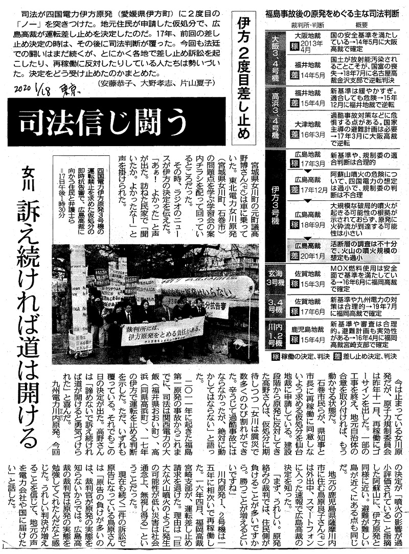 | [2020_01_18_11]伊方 2度目差し止め 司法信じ闘う 女川 訴え続ければ道は開ける(東京新聞2020年1月18日) |