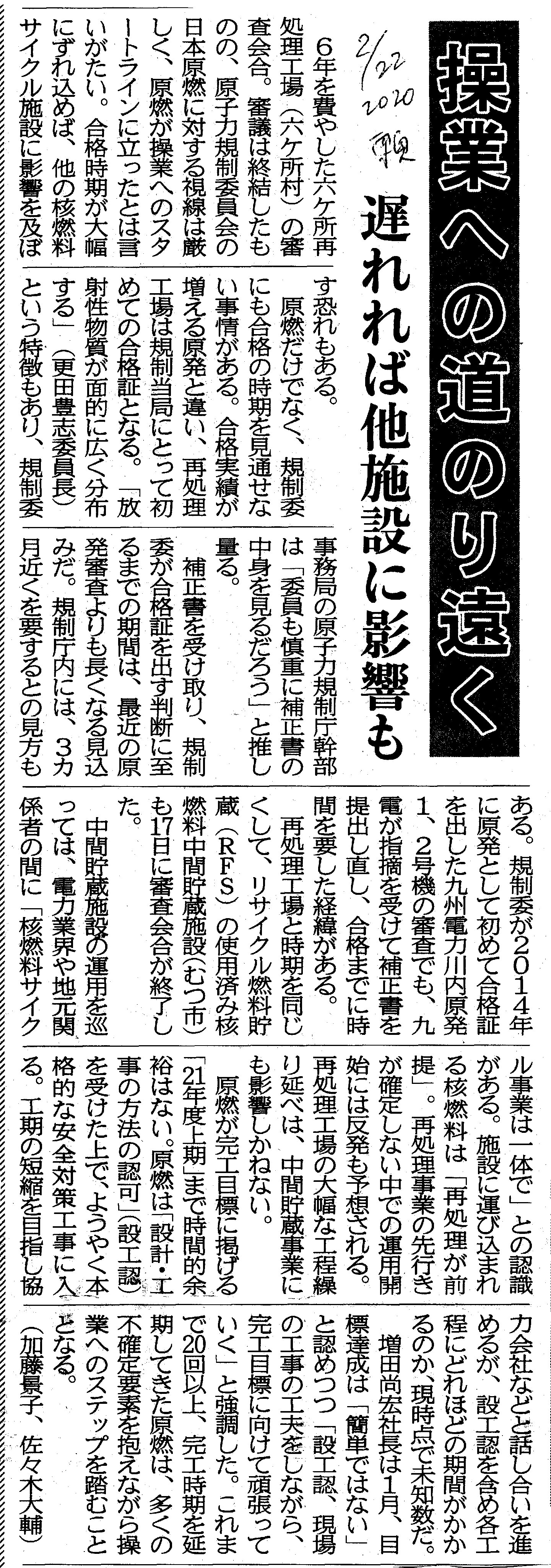 | [2020_02_22_08]操業への道のり遠く 遅れれば他施設に影響も(東奥日報2020年2月22日) |