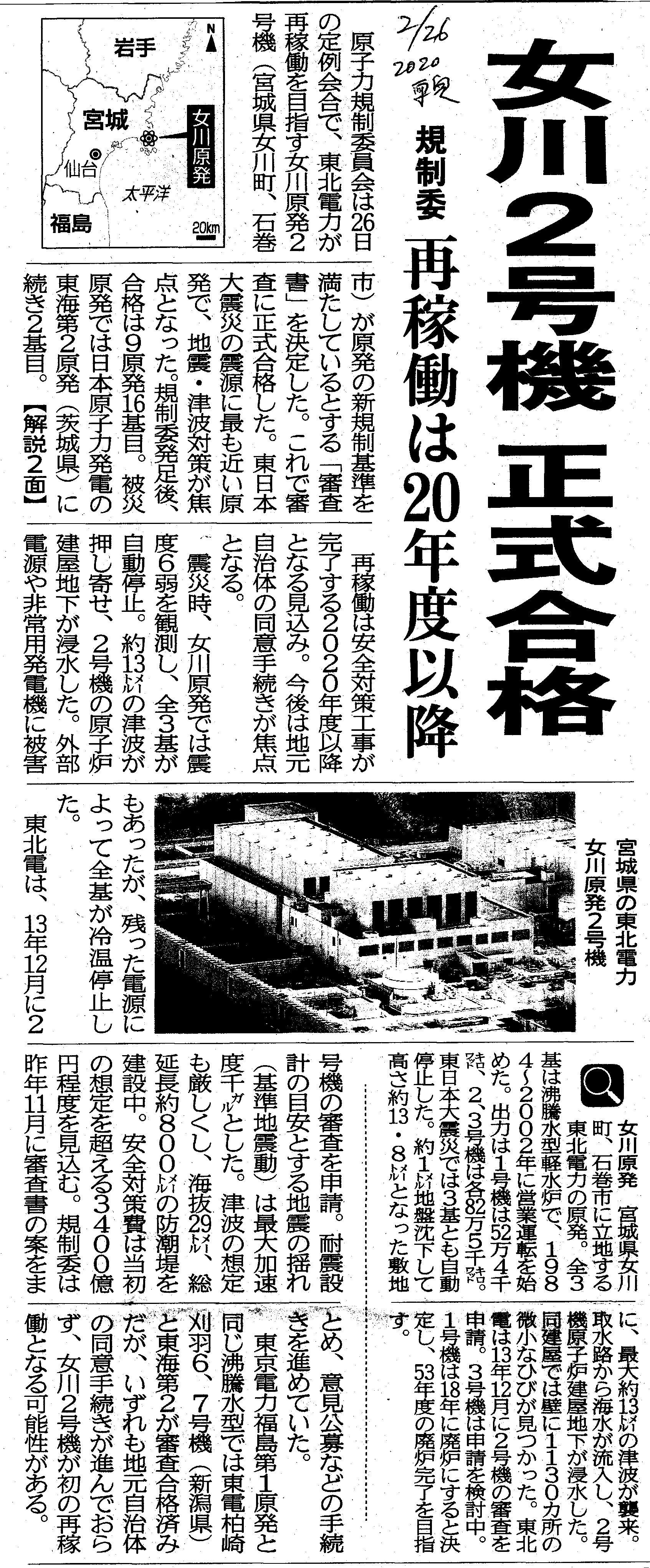 [2020_02_26_10]女川2号機 正式合格 規制委 再稼働は20年度以降(東奥日報2020年2月26日)